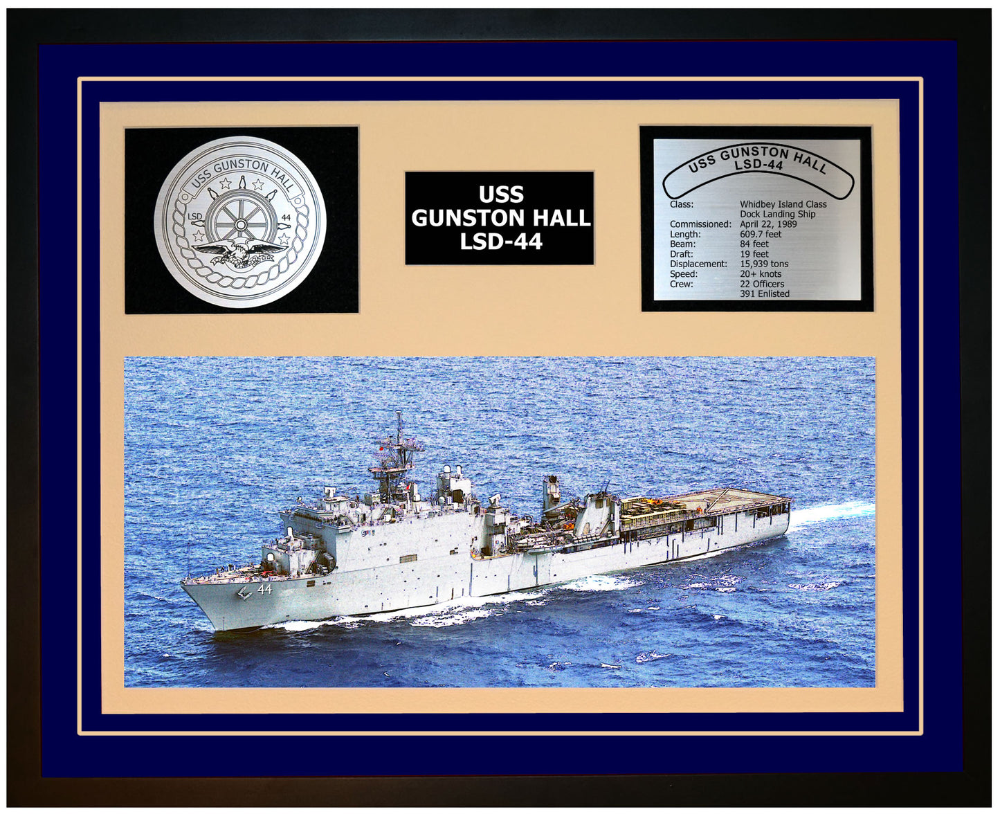 This is a beautiful ship display commemorating the USS GUNSTON HALL (LSD-44). The artwork depicts the USS GUNSTON HALL in all her glory. More than just an artistic concept of the ship, this display includes a custom designed ship crest plaque and an engraved ship statistics plaque. This product is richly finished with custom cut and sized double mats and framed with a high quality black frame. Only the best materials are used to complete our ship displays. Navy Emporium Ship Displays make a generous and personal gift for any Navy sailor.