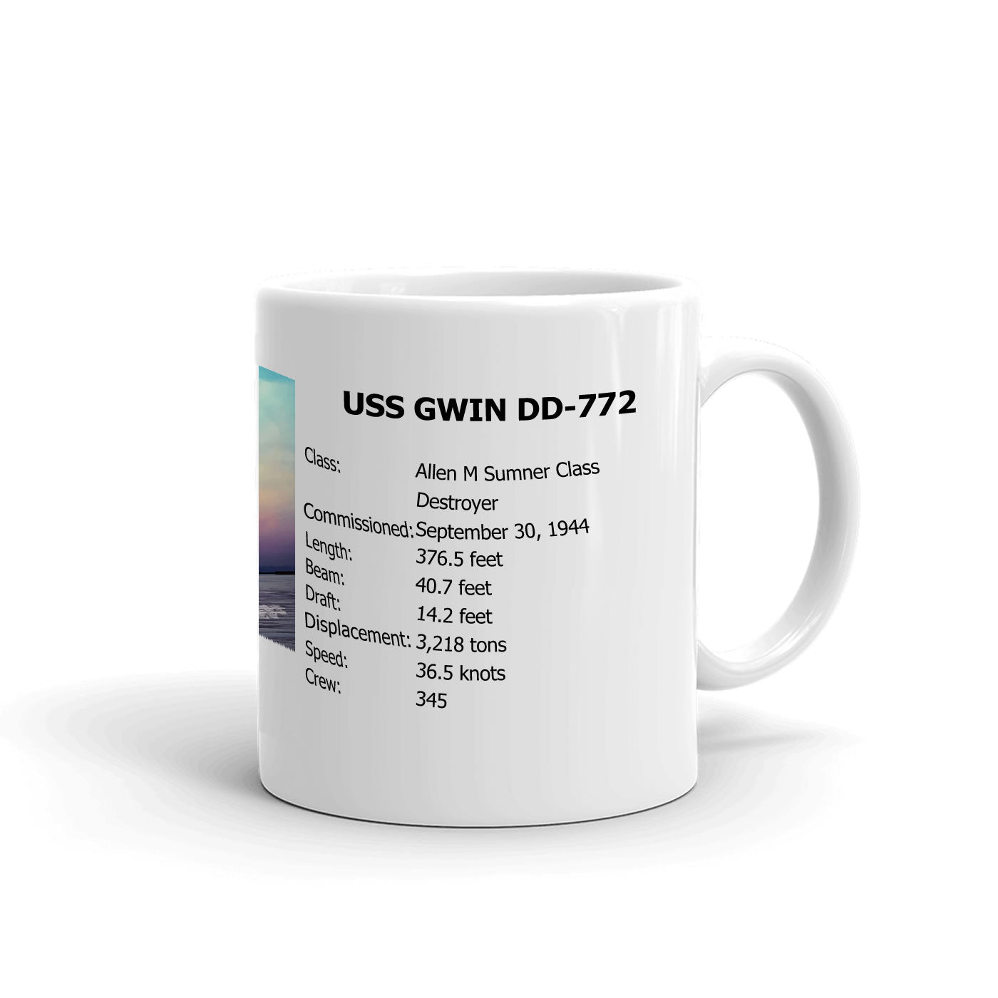 Celebrate your Navy pride with this USS GWIN DD-772 Coffee Mug. Pictured is custom art of your ship! Whether you're drinking your morning coffee, evening tea, or something in between “ this mug's for you! It's sturdy and glossy with a vivid print that'll withstand the microwave and dishwasher.
