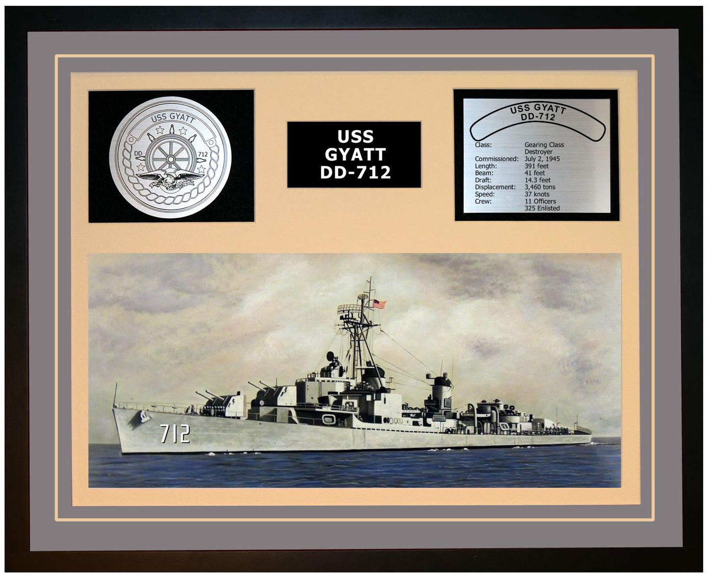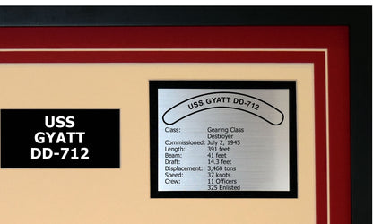 This is a beautiful ship display commemorating the USS GYATT (DD-712). The artwork depicts the USS GYATT in all her glory. More than just an artistic concept of the ship, this display includes a custom designed ship crest plaque and an engraved ship statistics plaque. This product is richly finished with custom cut and sized double mats and framed with a high quality black frame. Only the best materials are used to complete our ship displays. Navy Emporium Ship Displays make a generous and personal gift for any Navy sailor.