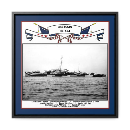Your Navy Veteran will love this 16 x 16 inch canvas photo print of the USS Haas DE-424. This print is richly displayed in a black floating frame. Available with a printed blue border color.