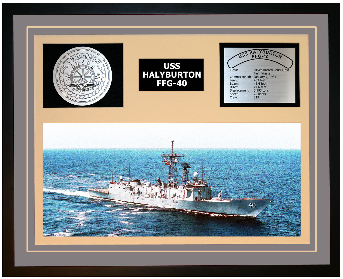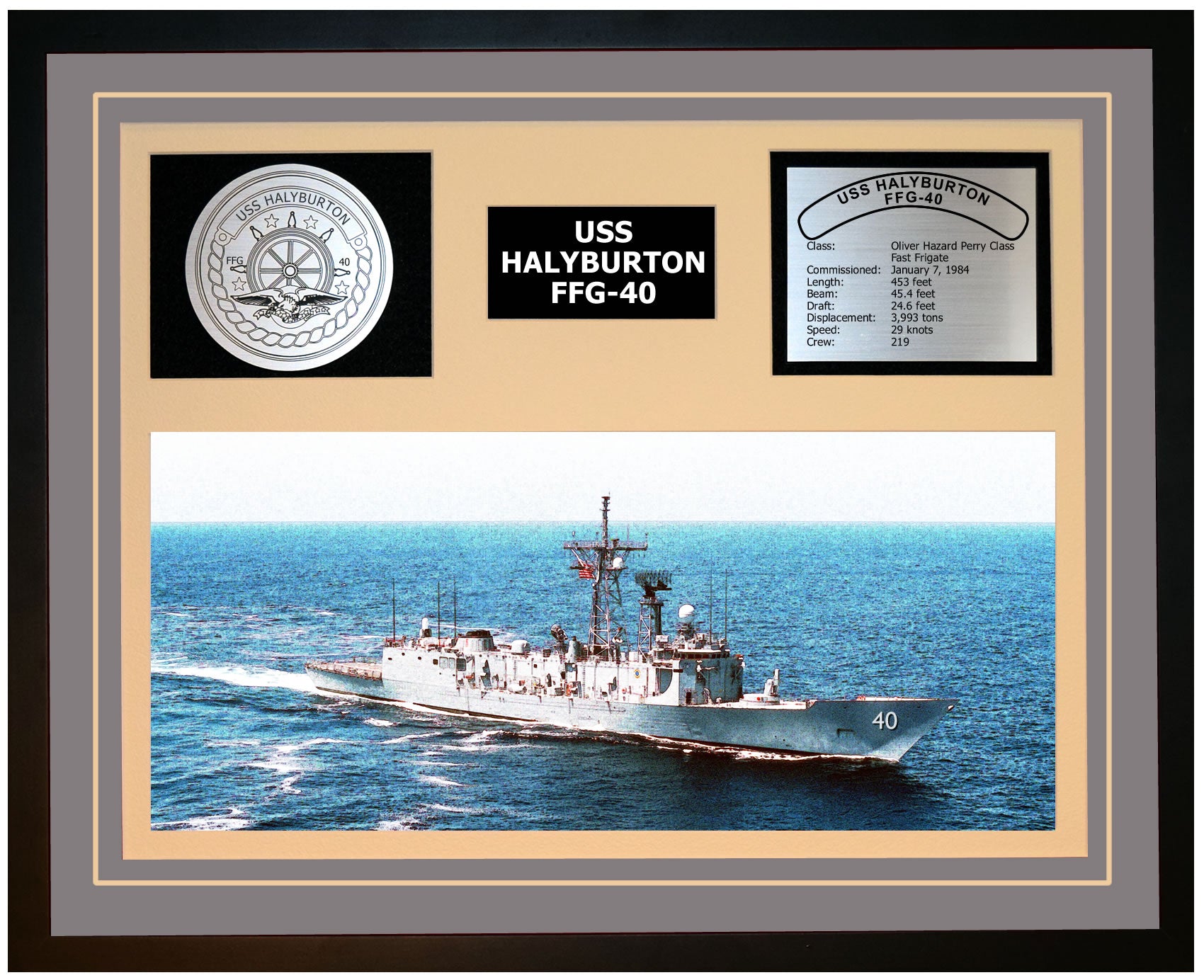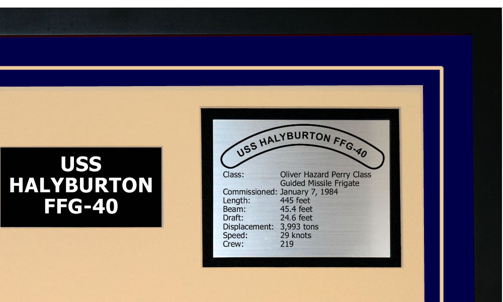 This is a beautiful ship display commemorating the USS HALYBURTON (FFG-40). The artwork depicts the USS HALYBURTON in all her glory. More than just an artistic concept of the ship, this display includes a custom designed ship crest plaque and an engraved ship statistics plaque. This product is richly finished with custom cut and sized double mats and framed with a high quality black frame. Only the best materials are used to complete our ship displays. Navy Emporium Ship Displays make a generous and personal gift for any Navy sailor.