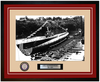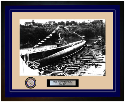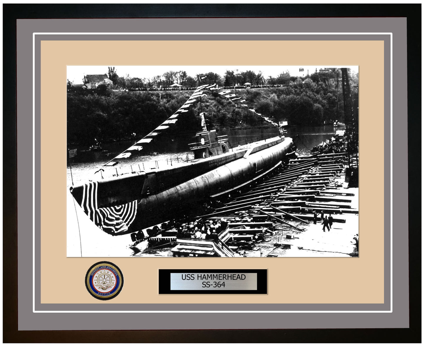 This photo of the USS Hammerhead SS 364 is framed and double matted with the highest quality construction in mind. The ship name and designation is engraved on chrome engraving stock and set on a beautiful felt backing. All this set in a custom cut fine inner mat and your choice of colors for the outer mat. The v-groove in the outer mat and custom engraving add high quality details that properly honor all the service members who served on this fine ship.