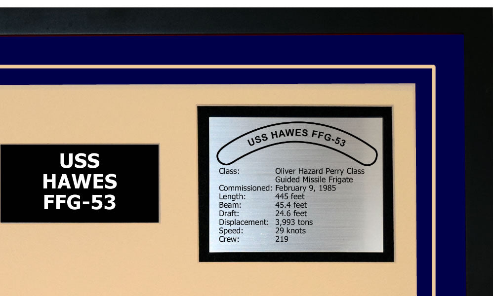 This is a beautiful ship display commemorating the USS HAWES (FFG-53). The artwork depicts the USS HAWES in all her glory. More than just an artistic concept of the ship, this display includes a custom designed ship crest plaque and an engraved ship statistics plaque. This product is richly finished with custom cut and sized double mats and framed with a high quality black frame. Only the best materials are used to complete our ship displays. Navy Emporium Ship Displays make a generous and personal gift for any Navy sailor.
