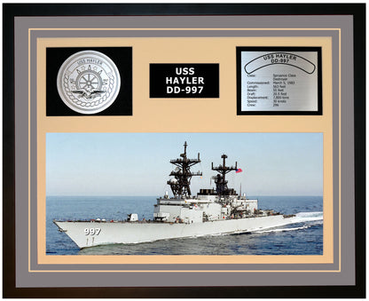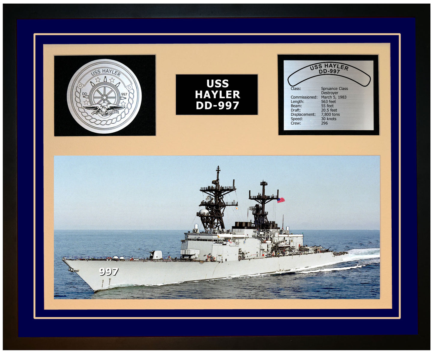 This is a beautiful ship display commemorating the USS HAYLER (DD-997). The artwork depicts the USS HAYLER in all her glory. More than just an artistic concept of the ship, this display includes a custom designed ship crest plaque and an engraved ship statistics plaque. This product is richly finished with custom cut and sized double mats and framed with a high quality black frame. Only the best materials are used to complete our ship displays. Navy Emporium Ship Displays make a generous and personal gift for any Navy sailor.