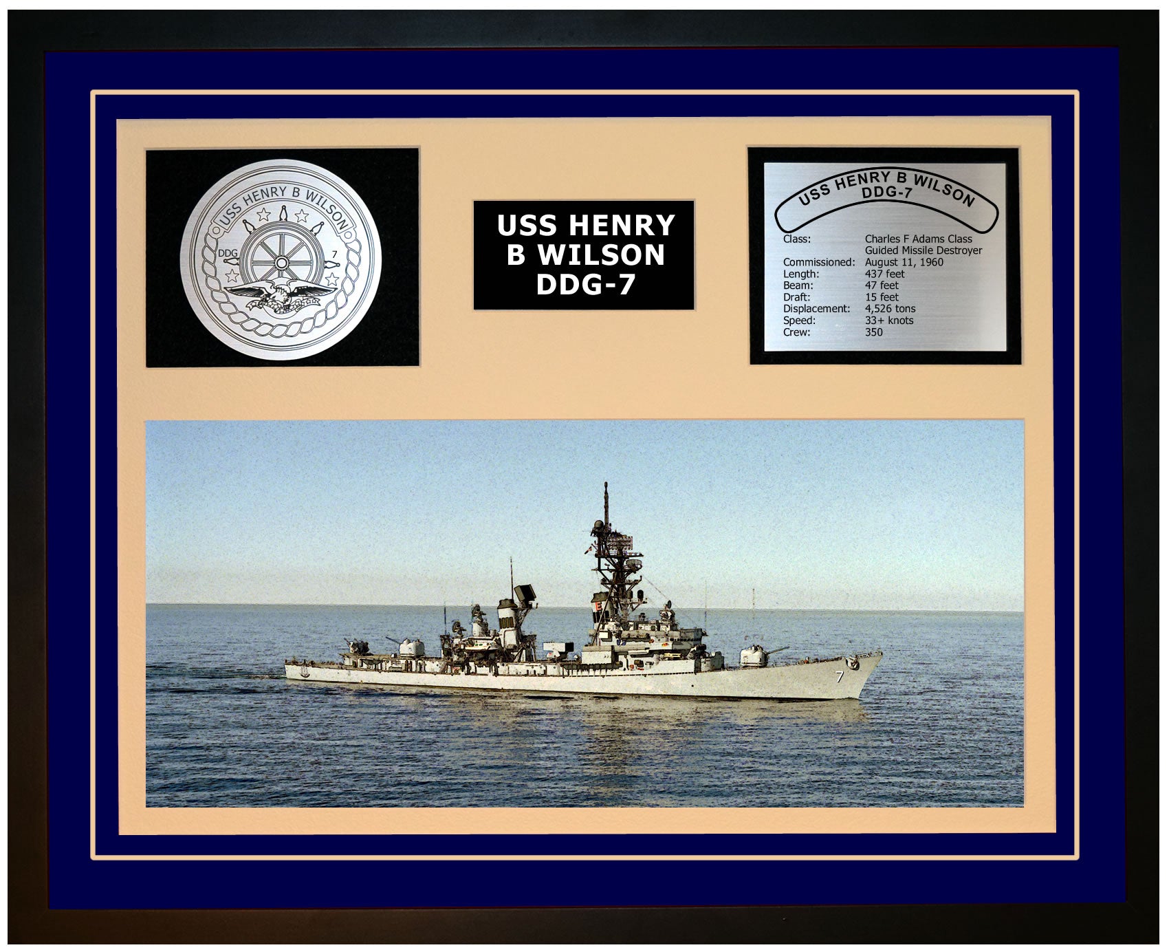 This is a beautiful ship display commemorating the USS HENRY B WILSON (DDG-7). The artwork depicts the USS HENRY B WILSON in all her glory. More than just an artistic concept of the ship, this display includes a custom designed ship crest plaque and an engraved ship statistics plaque. This product is richly finished with custom cut and sized double mats and framed with a high quality black frame. Only the best materials are used to complete our ship displays. Navy Emporium Ship Displays make a generous and personal gift for any Navy sailor.
