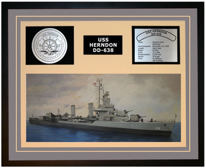 This is a beautiful ship display commemorating the USS HERNDON (DD-638). The artwork depicts the USS HERNDON in all her glory. More than just an artistic concept of the ship, this display includes a custom designed ship crest plaque and an engraved ship statistics plaque. This product is richly finished with custom cut and sized double mats and framed with a high quality black frame. Only the best materials are used to complete our ship displays. Navy Emporium Ship Displays make a generous and personal gift for any Navy sailor.