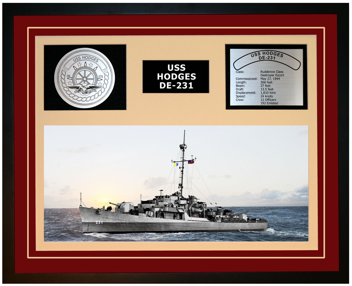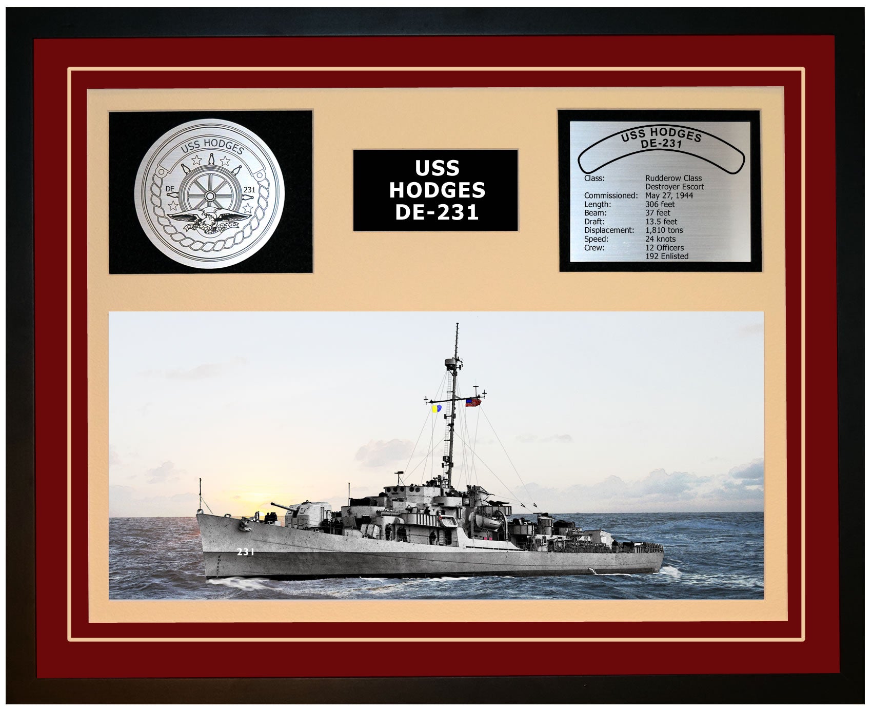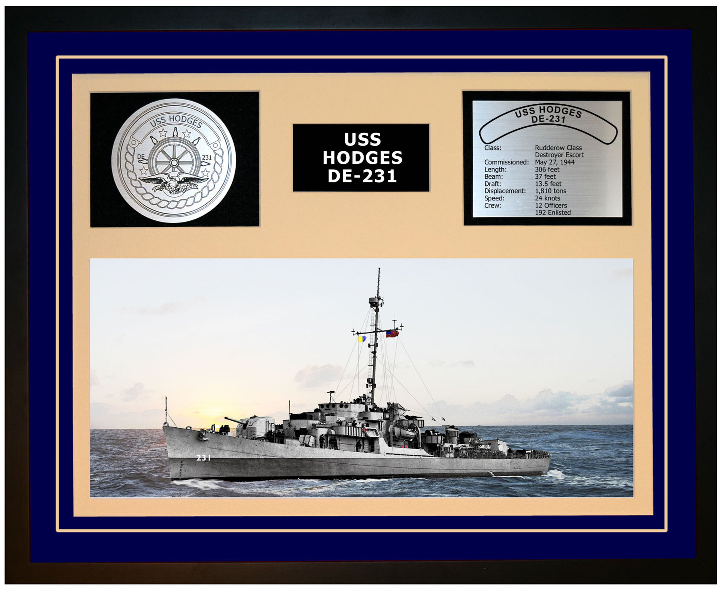 This is a beautiful ship display commemorating the USS HODGES (DE-231). The artwork depicts the USS HODGES in all her glory. More than just an artistic concept of the ship, this display includes a custom designed ship crest plaque and an engraved ship statistics plaque. This product is richly finished with custom cut and sized double mats and framed with a high quality black frame. Only the best materials are used to complete our ship displays. Navy Emporium Ship Displays make a generous and personal gift for any Navy sailor.