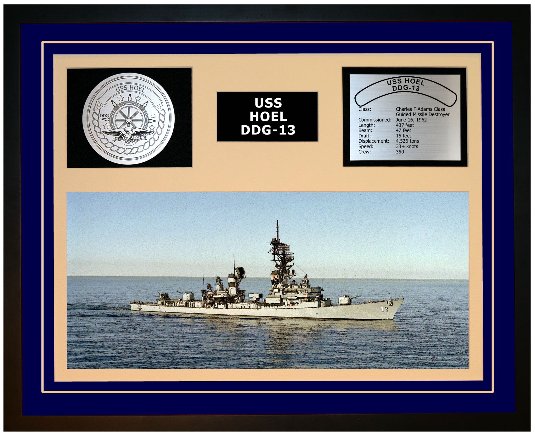 This is a beautiful ship display commemorating the USS HOEL (DDG-13). The artwork depicts the USS HOEL in all her glory. More than just an artistic concept of the ship, this display includes a custom designed ship crest plaque and an engraved ship statistics plaque. This product is richly finished with custom cut and sized double mats and framed with a high quality black frame. Only the best materials are used to complete our ship displays. Navy Emporium Ship Displays make a generous and personal gift for any Navy sailor.