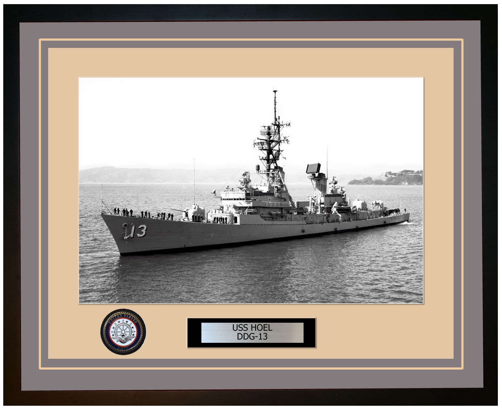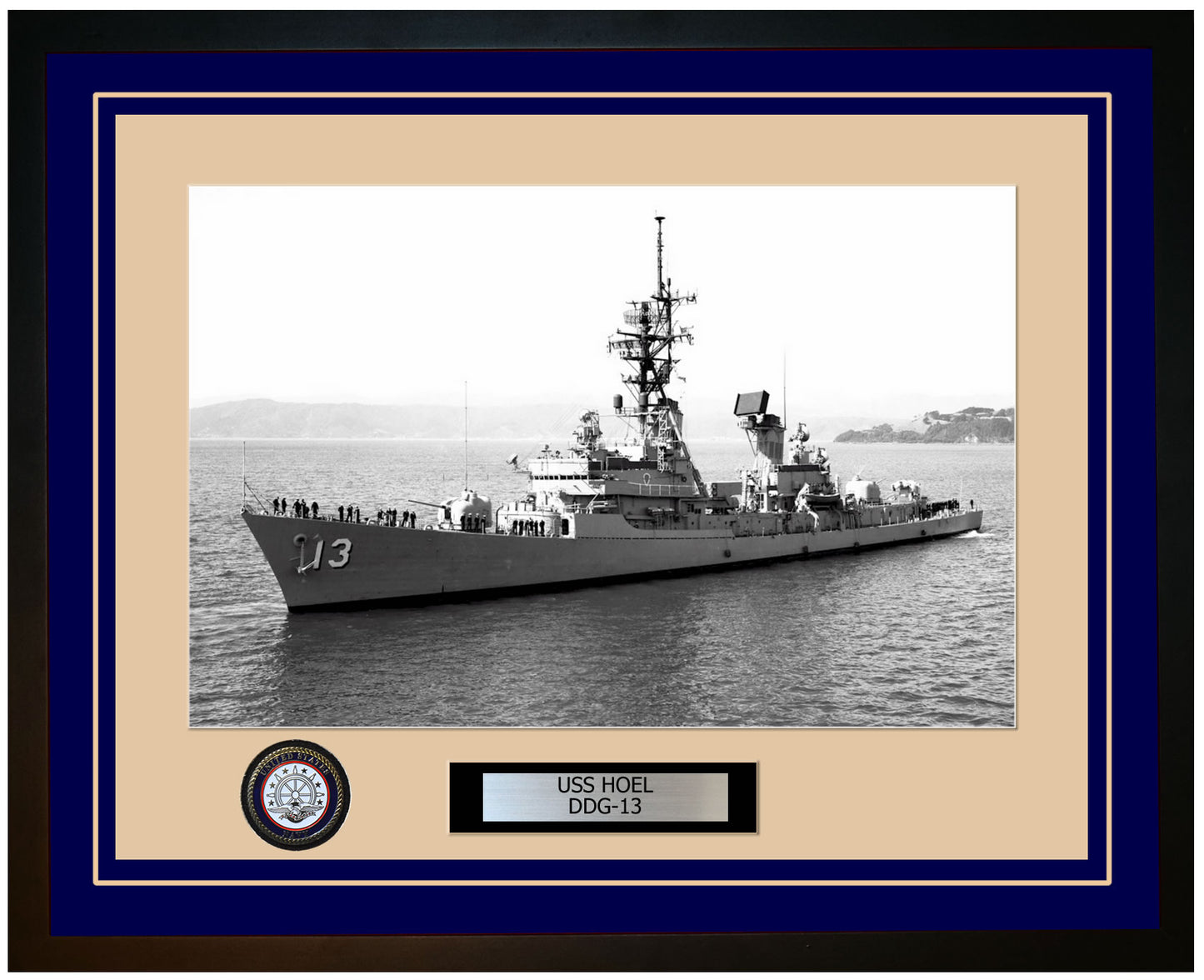 This photo of the USS HOEL (DDG-13) is framed and double matted with the highest quality construction in mind. The ship name and designation is engraved on chrome engraving stock and set on a beautiful felt backing. All this set in a custom cut fine inner mat and your choice of colors for the outer mat. The v-groove in the outer mat and custom engraving add high quality details that properly honor all the service members who served on this fine ship.