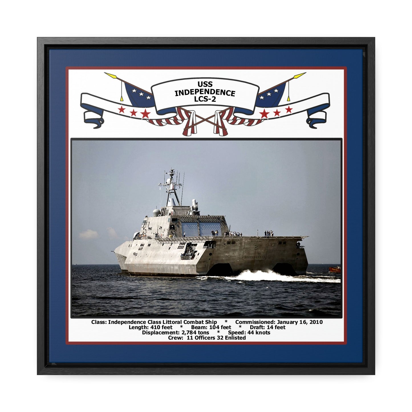 Your Navy Veteran will love this 16 x 16 inch canvas photo print of the USS Independence LCS-2. This print is richly displayed in a black floating frame. Available with a printed blue border color.