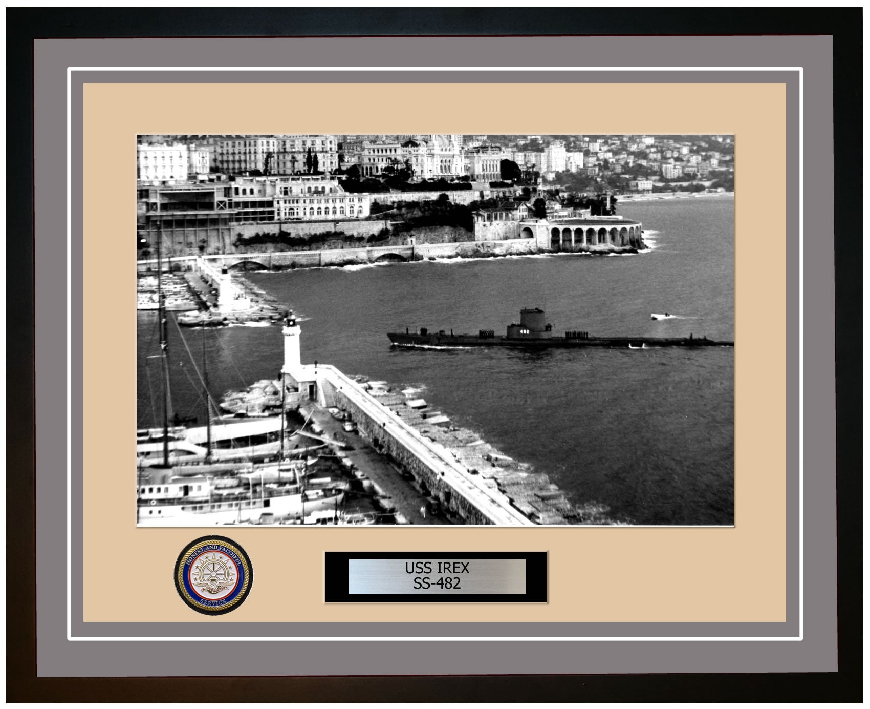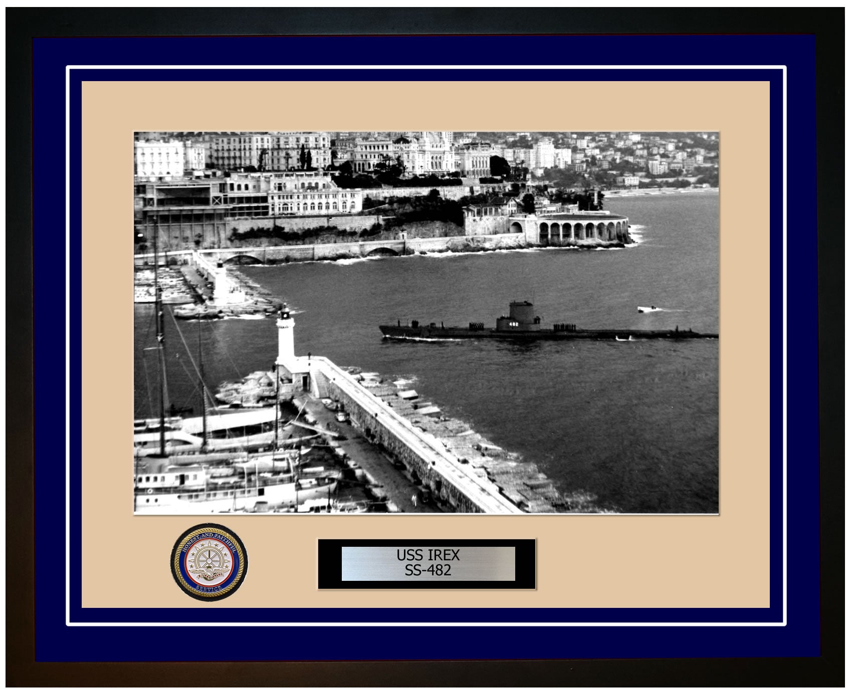 This photo of the USS Irex SS 482 is framed and double matted with the highest quality construction in mind. The ship name and designation is engraved on chrome engraving stock and set on a beautiful felt backing. All this set in a custom cut fine inner mat and your choice of colors for the outer mat. The v-groove in the outer mat and custom engraving add high quality details that properly honor all the service members who served on this fine ship.