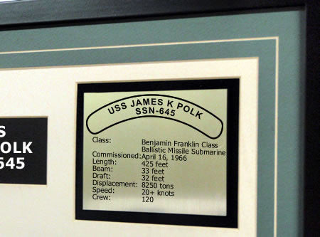 This is a beautiful ship display commemorating the USS James K Polk (SSN645) and all those who served aboard. The artwork depicts the USS James K Polk in all her glory. The display features not a photograph, but an artist's creation of the ship as well as an engraved custom US Navy plaque and an engraved ship's statistics plaque. This product is richly finished with custom cut and sized double mats and framed with a high quality black frame. Only the best materials are used to complete our ship displays. Navy Emporium's Ship Displays make a generous and personal gift for any Navy sailor.