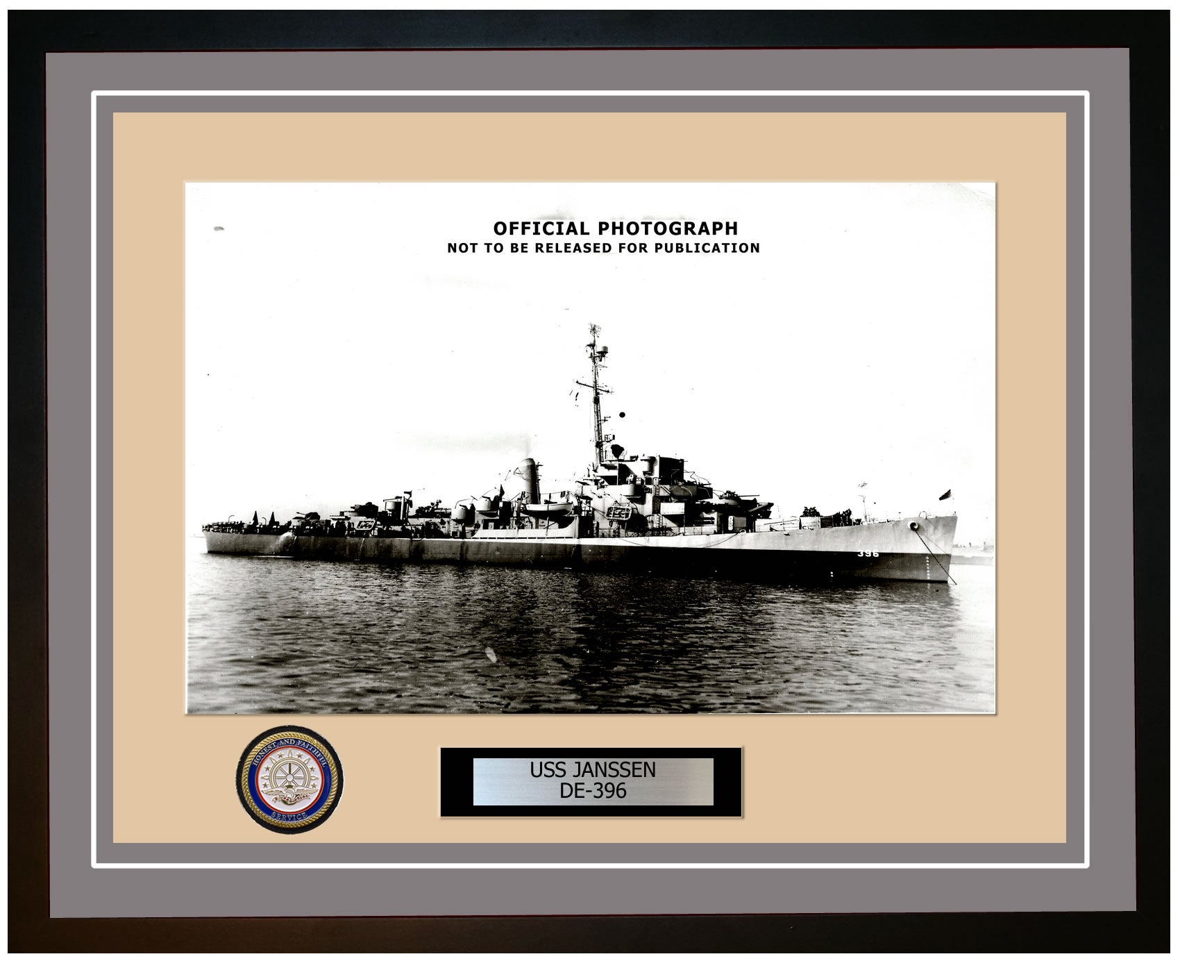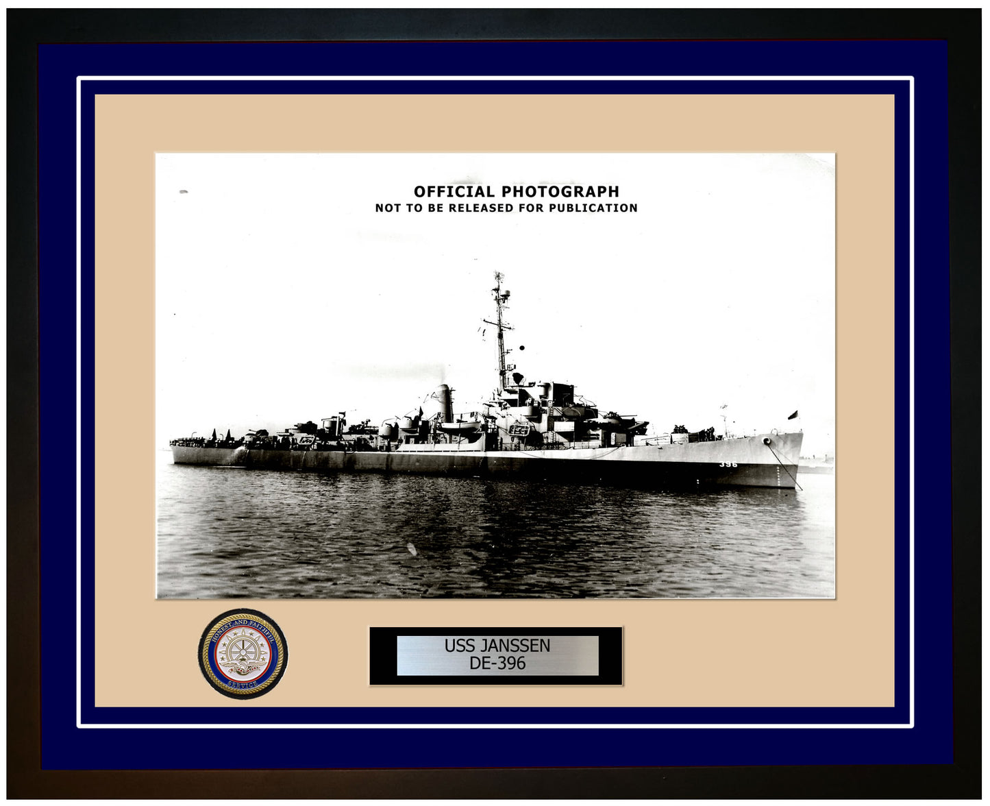 This photo of the USS Janssen (DE-396) is framed and double matted with the highest quality construction in mind. The ship name and designation is engraved on chrome engraving stock and set on a beautiful felt backing. All this set in a custom cut fine inner mat and your choice of colors for the outer mat. The v-groove in the outer mat and custom engraving add high quality details that properly honor all the service members who served on this fine ship.