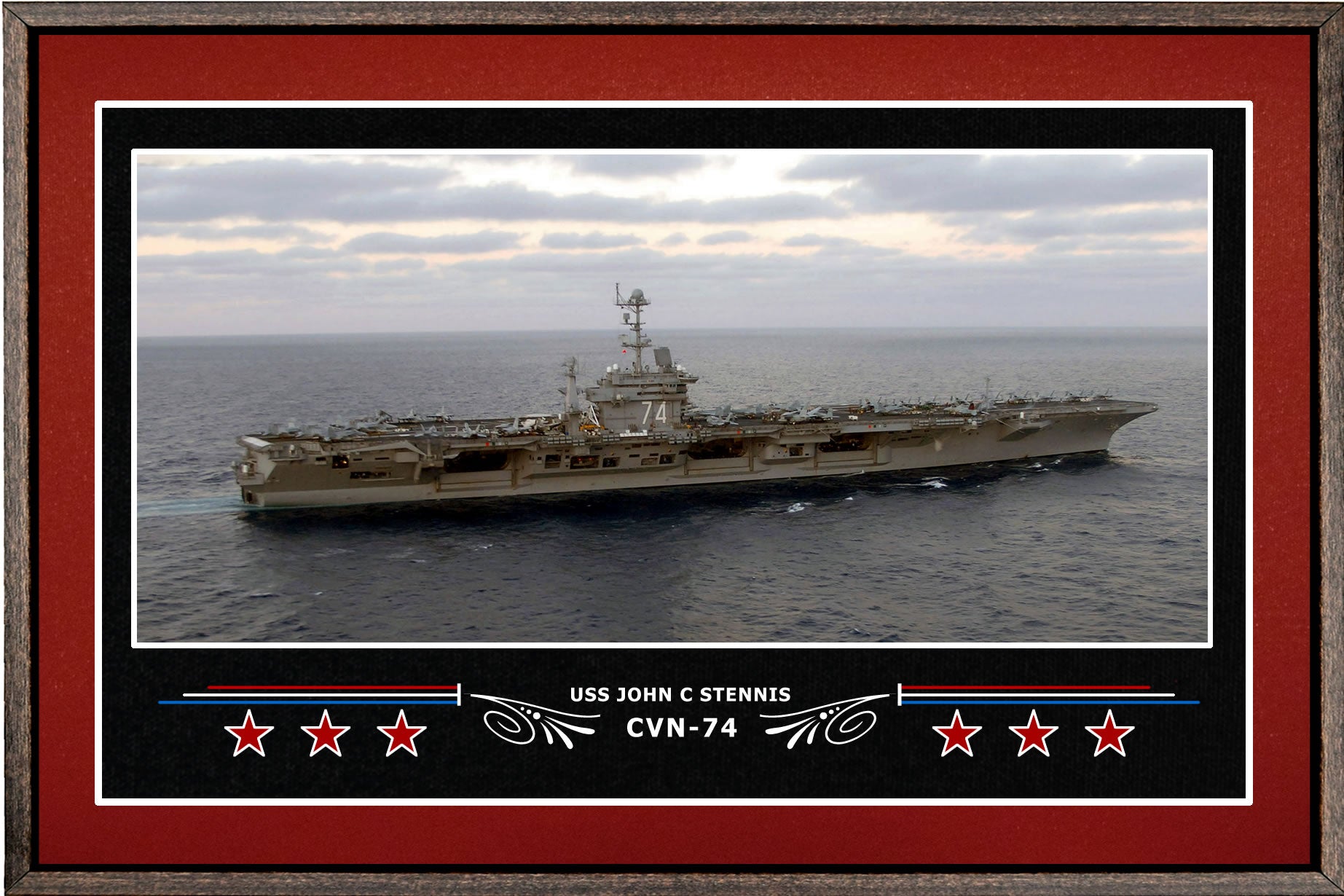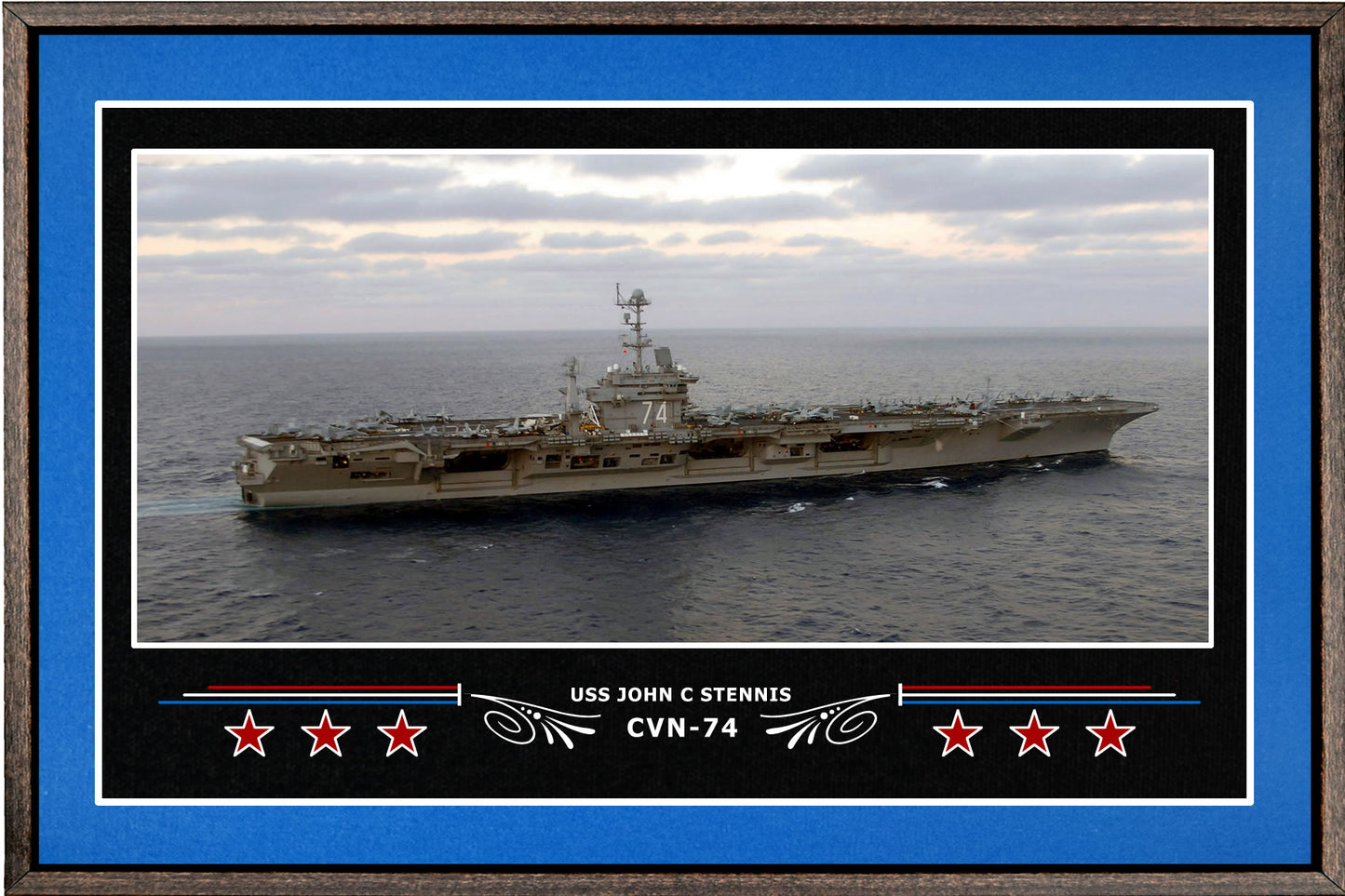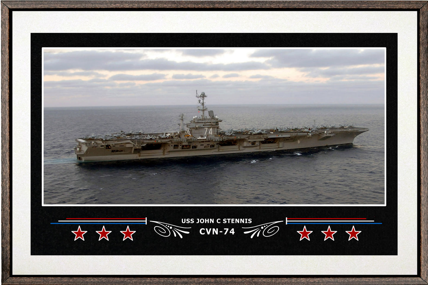 Your Navy Veteran will love this 18 x 12 inch canvas print of the USS John C Stennis CVN-74. This print is richly displayed in a walnut floating frame. Available in various border colors.