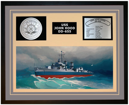This is a beautiful ship display commemorating the USS JOHN HOOD (DD-655). The artwork depicts the USS JOHN HOOD in all her glory. More than just an artistic concept of the ship, this display includes a custom designed ship crest plaque and an engraved ship statistics plaque. This product is richly finished with custom cut and sized double mats and framed with a high quality black frame. Only the best materials are used to complete our ship displays. Navy Emporium Ship Displays make a generous and personal gift for any Navy sailor.