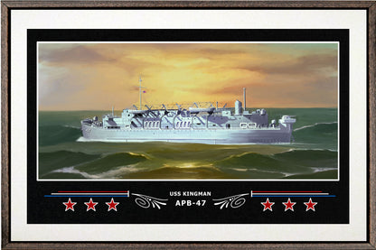 Your Navy Veteran will love this 18 x 12 inch canvas print of the USS Kingman APB-47. This print is richly displayed in a walnut floating frame. Available in various border colors.