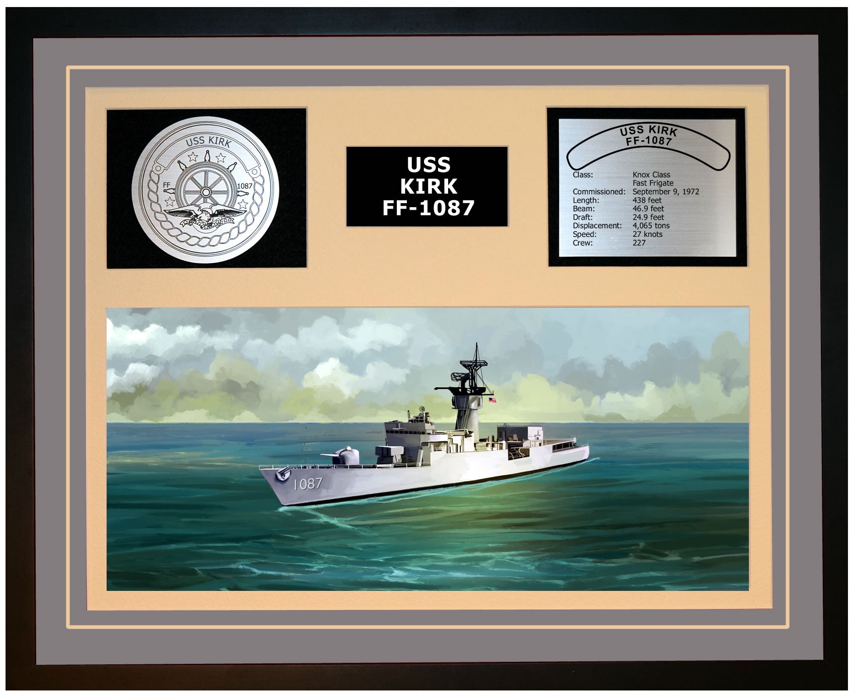 This is a beautiful ship display commemorating the USS KIRK (FF-1087). The artwork depicts the USS KIRK in all her glory. More than just an artistic concept of the ship, this display includes a custom designed ship crest plaque and an engraved ship statistics plaque. This product is richly finished with custom cut and sized double mats and framed with a high quality black frame. Only the best materials are used to complete our ship displays. Navy Emporium Ship Displays make a generous and personal gift for any Navy sailor. in all her glory. More than just an artistic concept of the ship, this display includes a custom designed ship crest plaque and an engraved ship statistics plaque. This product is richly finished with custom cut and sized double mats and framed with a high quality black frame. Only the best materials are used to complete our ship displays. Navy Emporium Ship Displays make a generous and personal gift for any Navy sailor.