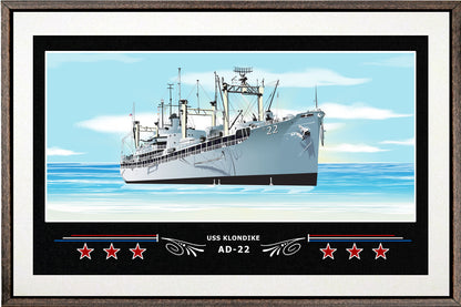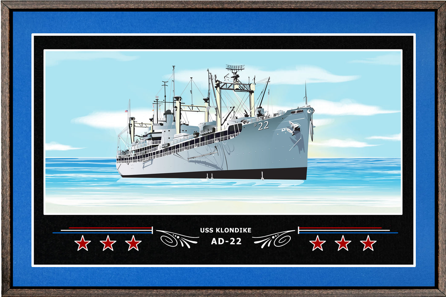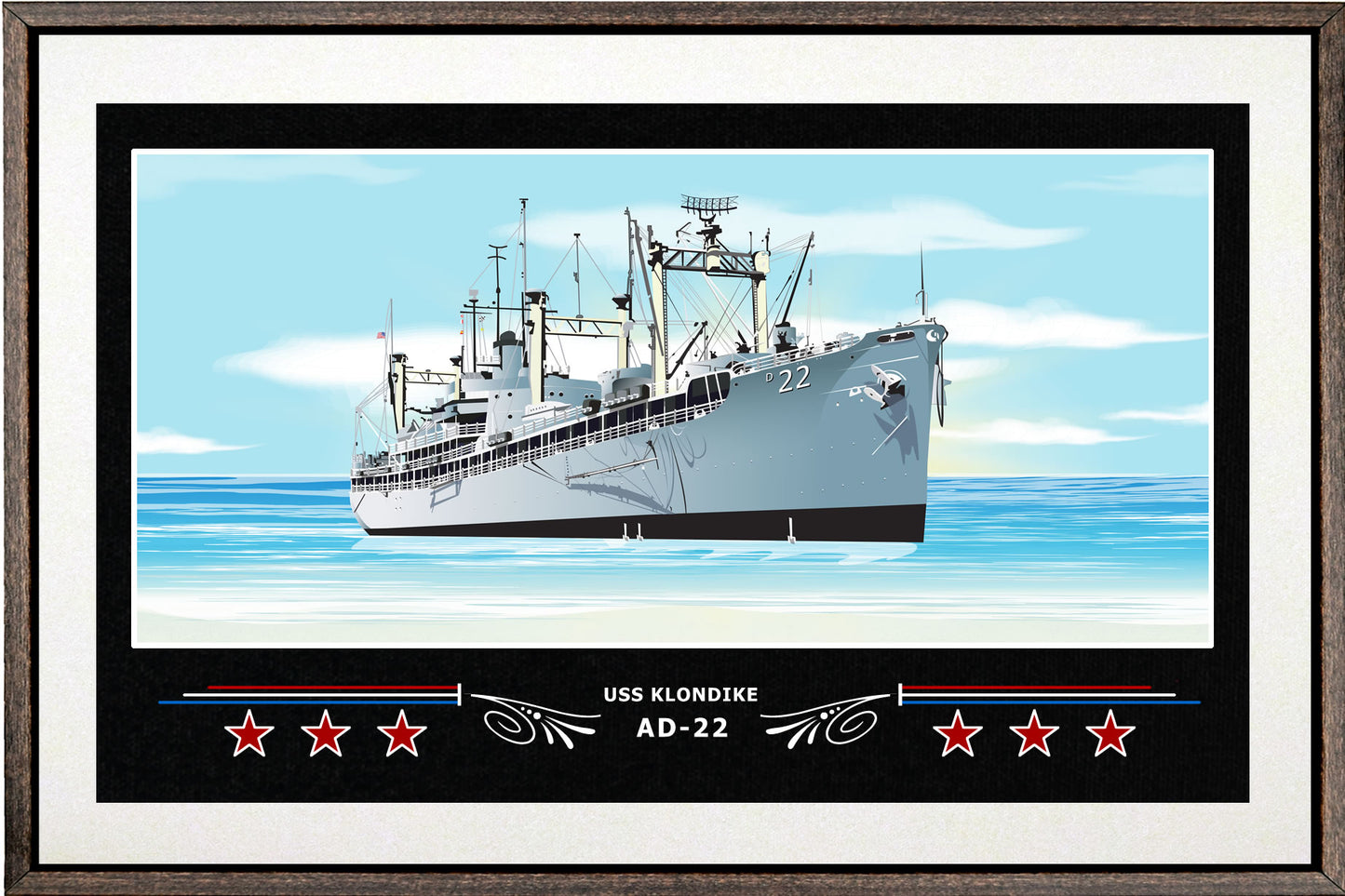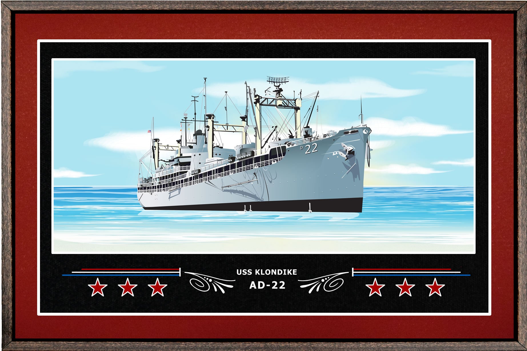 Your Navy Veteran will love this 18 x 12 inch canvas print of the USS Klondike AD-22. This print is richly displayed in a walnut floating frame. Available in various border colors.