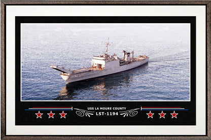 Your Navy Veteran will love this 18 x 12 inch canvas print of the USS La Moure County LST-1194. This print is richly displayed in a walnut floating frame. Available in various border colors.
