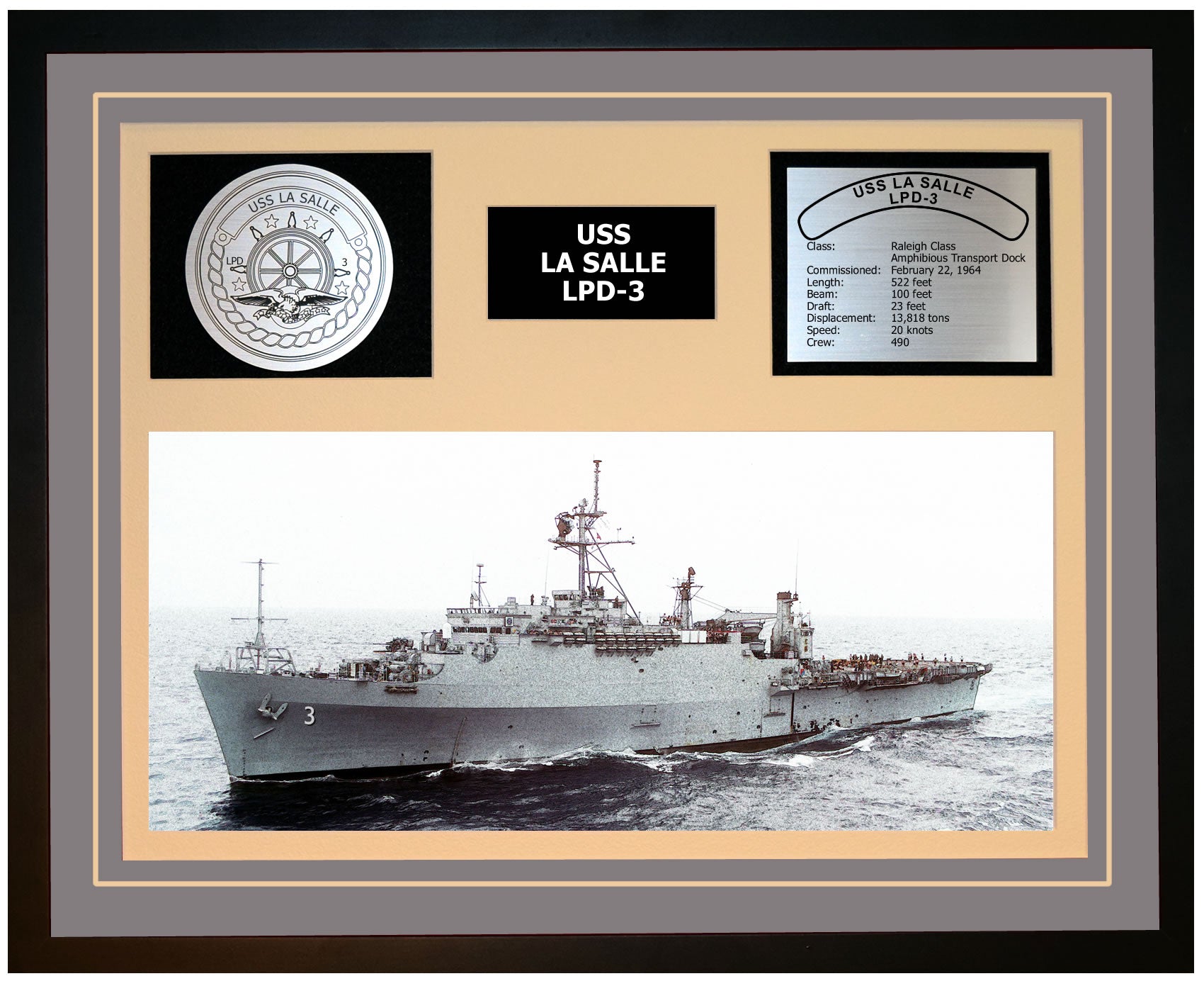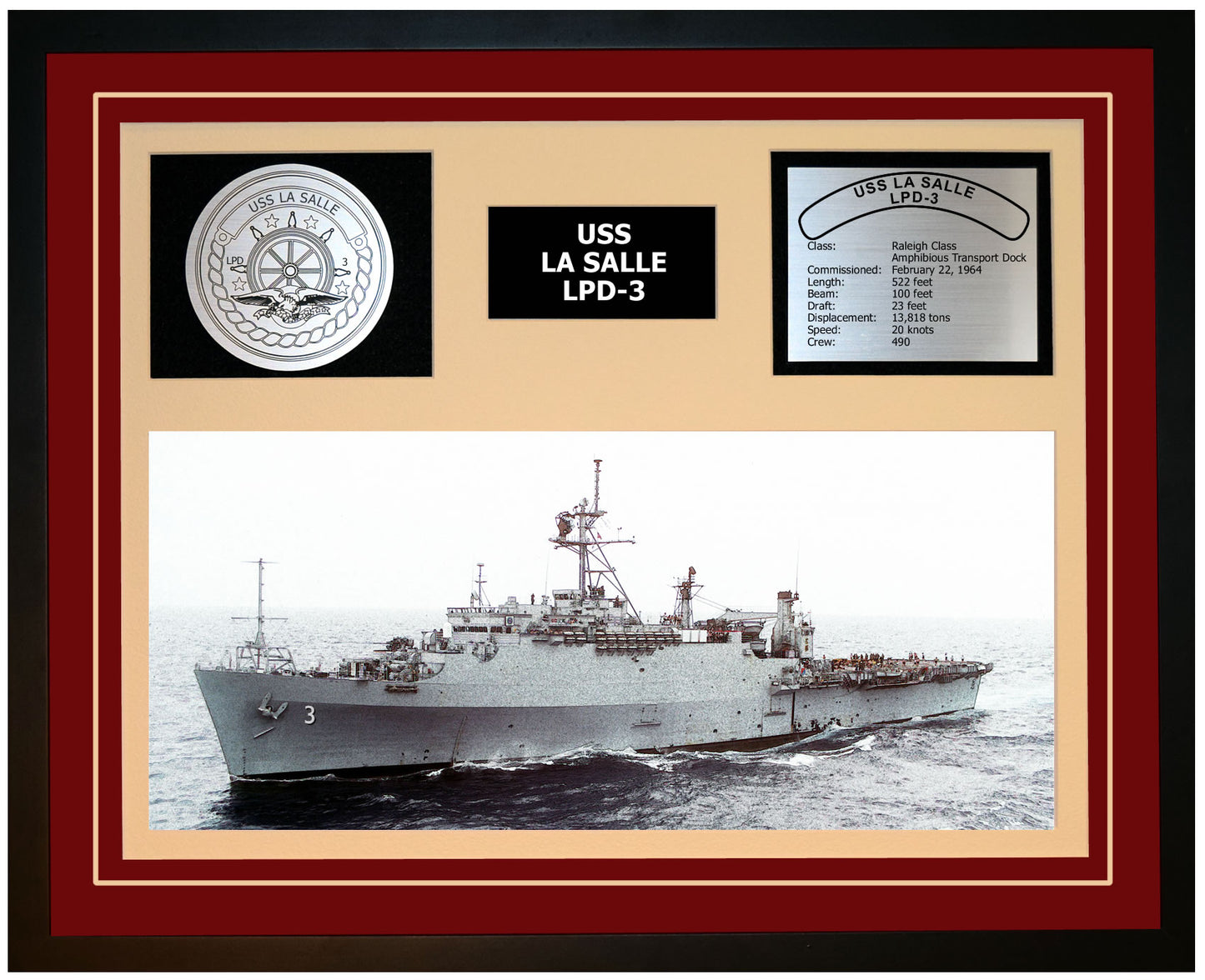 This is a beautiful ship display commemorating the USS LA SALLE (LPD-3). The artwork depicts the USS LA SALLE in all her glory. More than just an artistic concept of the ship, this display includes a custom designed ship crest plaque and an engraved ship statistics plaque. This product is richly finished with custom cut and sized double mats and framed with a high quality black frame. Only the best materials are used to complete our ship displays. Navy Emporium Ship Displays make a generous and personal gift for any Navy sailor.