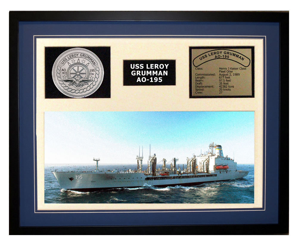 This is a beautiful ship display commemorating the USS Leroy Grumman (AO-195) and all those who served aboard. The artwork depicts the USS Leroy Grumman in all her glory. The display features not a photograph, but an artist's creation of the ship as well as an engraved custom US Navy plaque and an engraved ship's statistics plaque. This product is richly finished with custom cut and sized double mats and framed with a high quality black frame. Only the best materials are used to complete our ship displays. Navy Emporium's Ship Displays make a generous and personal gift for any Navy sailor.