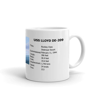 Celebrate your Navy pride with this USS LLOYD DE-209 Coffee Mug. Pictured is custom art of your ship! Whether you're drinking your morning coffee, evening tea, or something in between “ this mug's for you! It's sturdy and glossy with a vivid print that'll withstand the microwave and dishwasher.