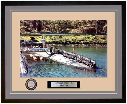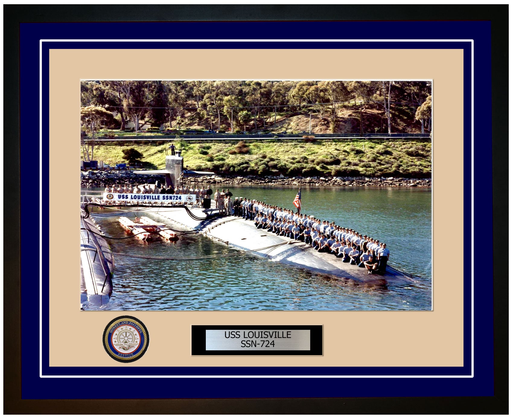 This photo of the USS Louisville SSN 724 is framed and double matted with the highest quality construction in mind. The ship name and designation is engraved on chrome engraving stock and set on a beautiful felt backing. All this set in a custom cut fine inner mat and your choice of colors for the outer mat. The v-groove in the outer mat and custom engraving add high quality details that properly honor all the service members who served on this fine ship.