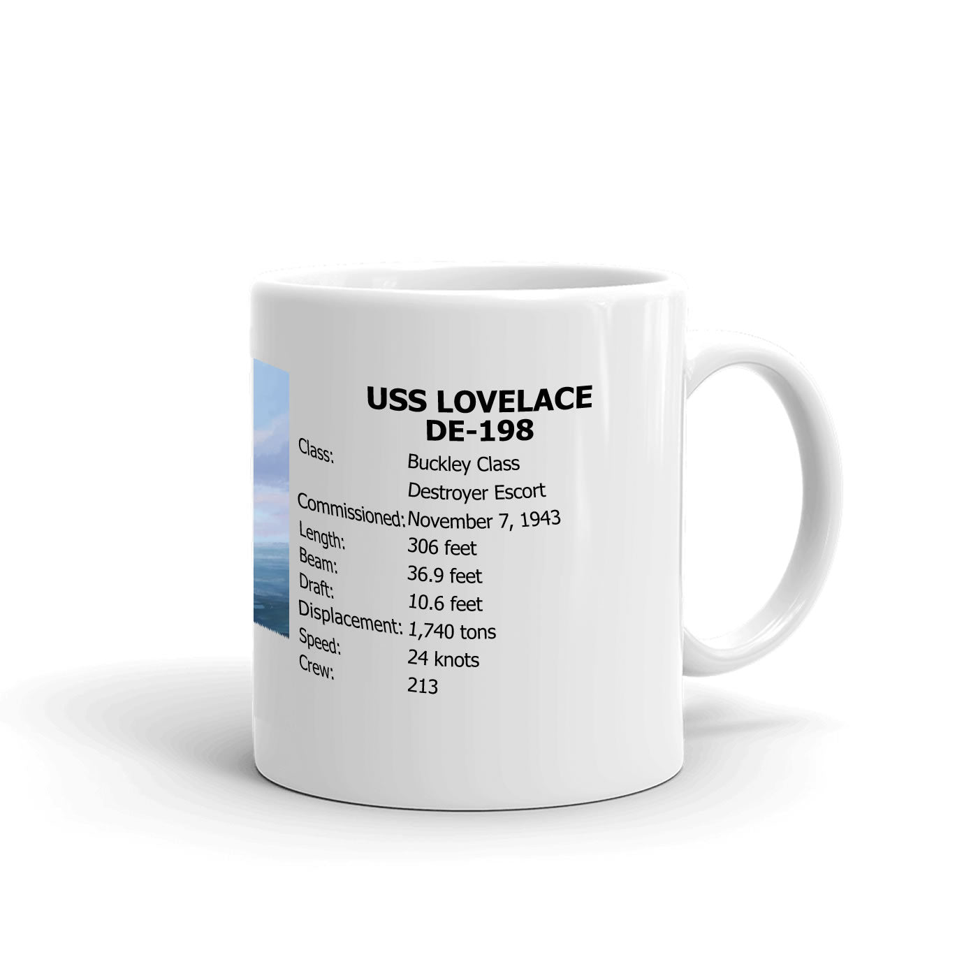 Celebrate your Navy pride with this USS LOVELACE DE-198 Coffee Mug. Pictured is custom art of your ship! Whether you're drinking your morning coffee, evening tea, or something in between “ this mug's for you! It's sturdy and glossy with a vivid print that'll withstand the microwave and dishwasher.