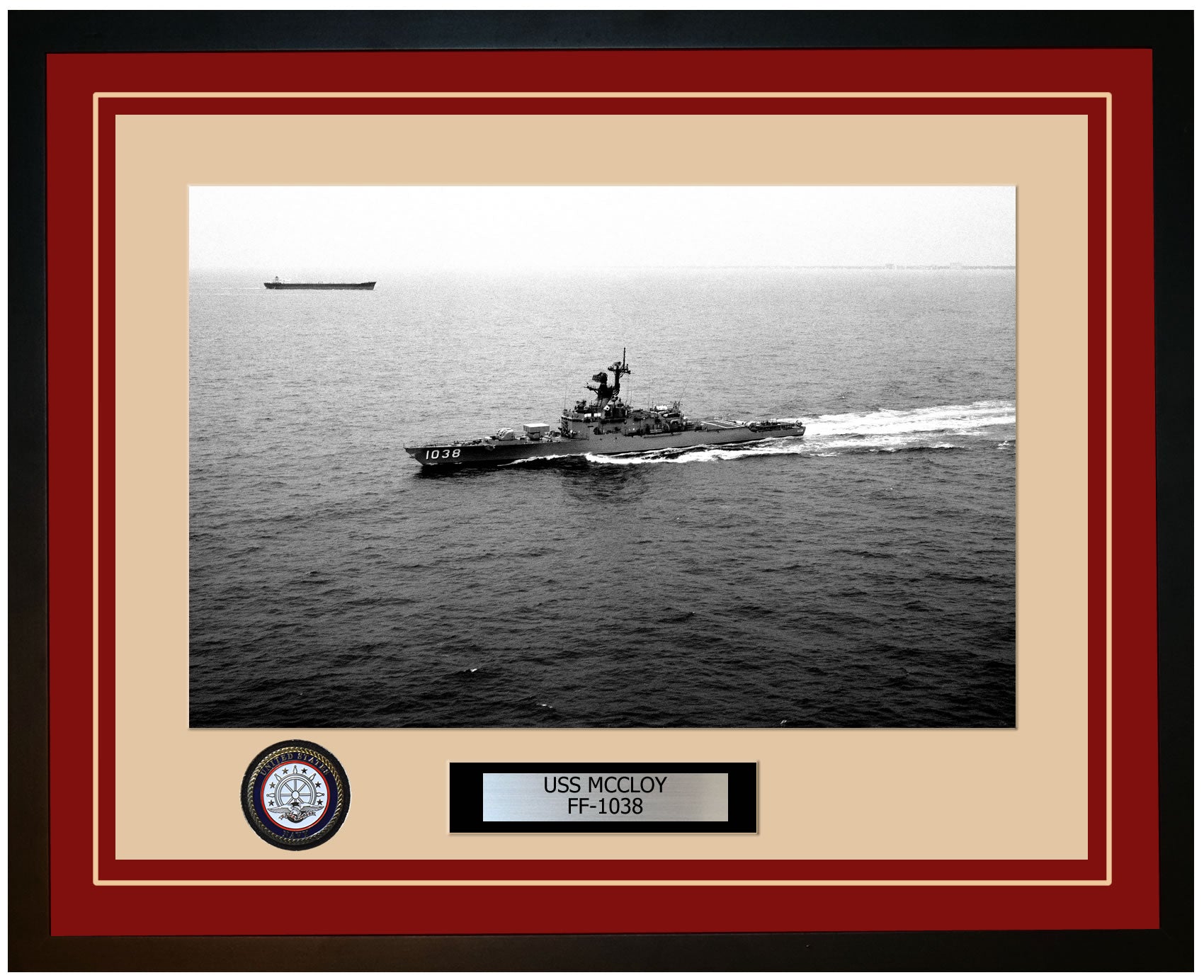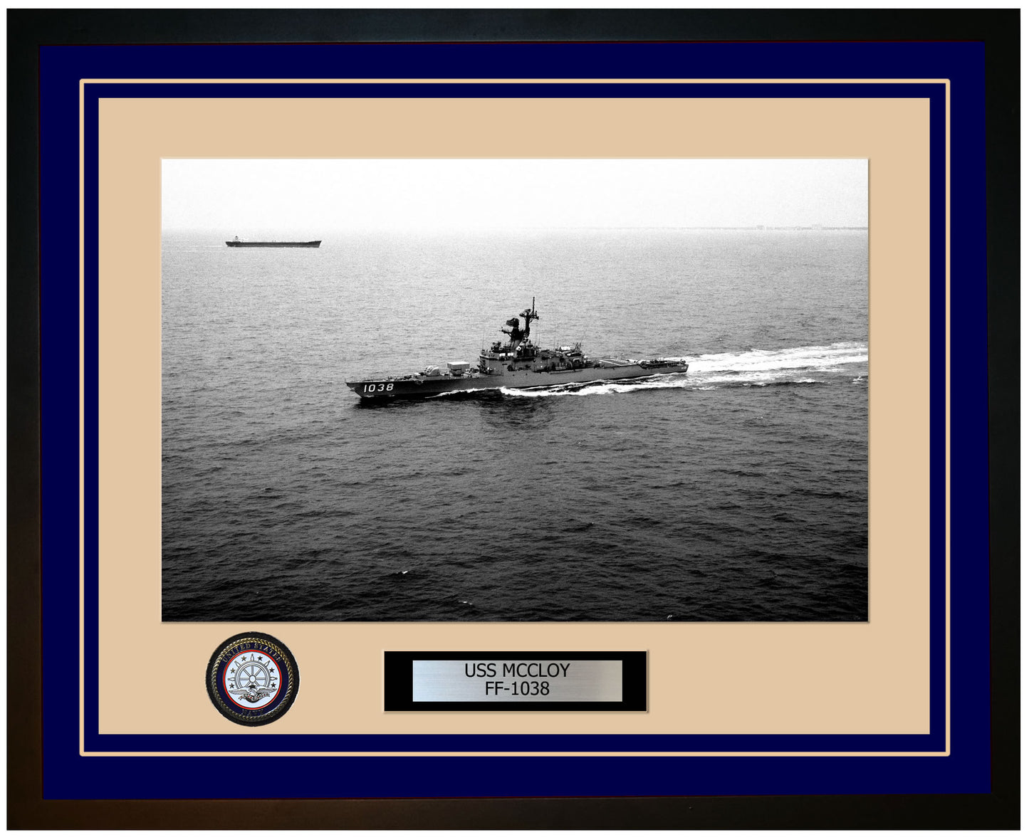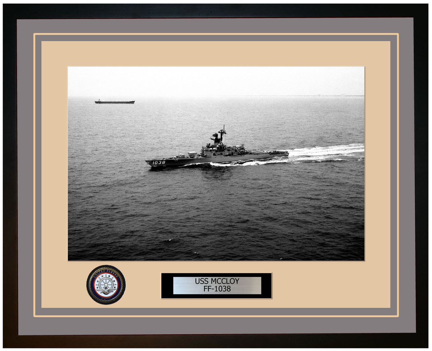 This photo of the USS MCCLOY (FF-1038) is framed and double matted with the highest quality construction in mind. The ship name and designation is engraved on chrome engraving stock and set on a beautiful felt backing. All this set in a custom cut fine inner mat and your choice of colors for the outer mat. The v-groove in the outer mat and custom engraving add high quality details that properly honor all the service members who served on this fine ship.