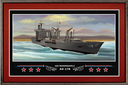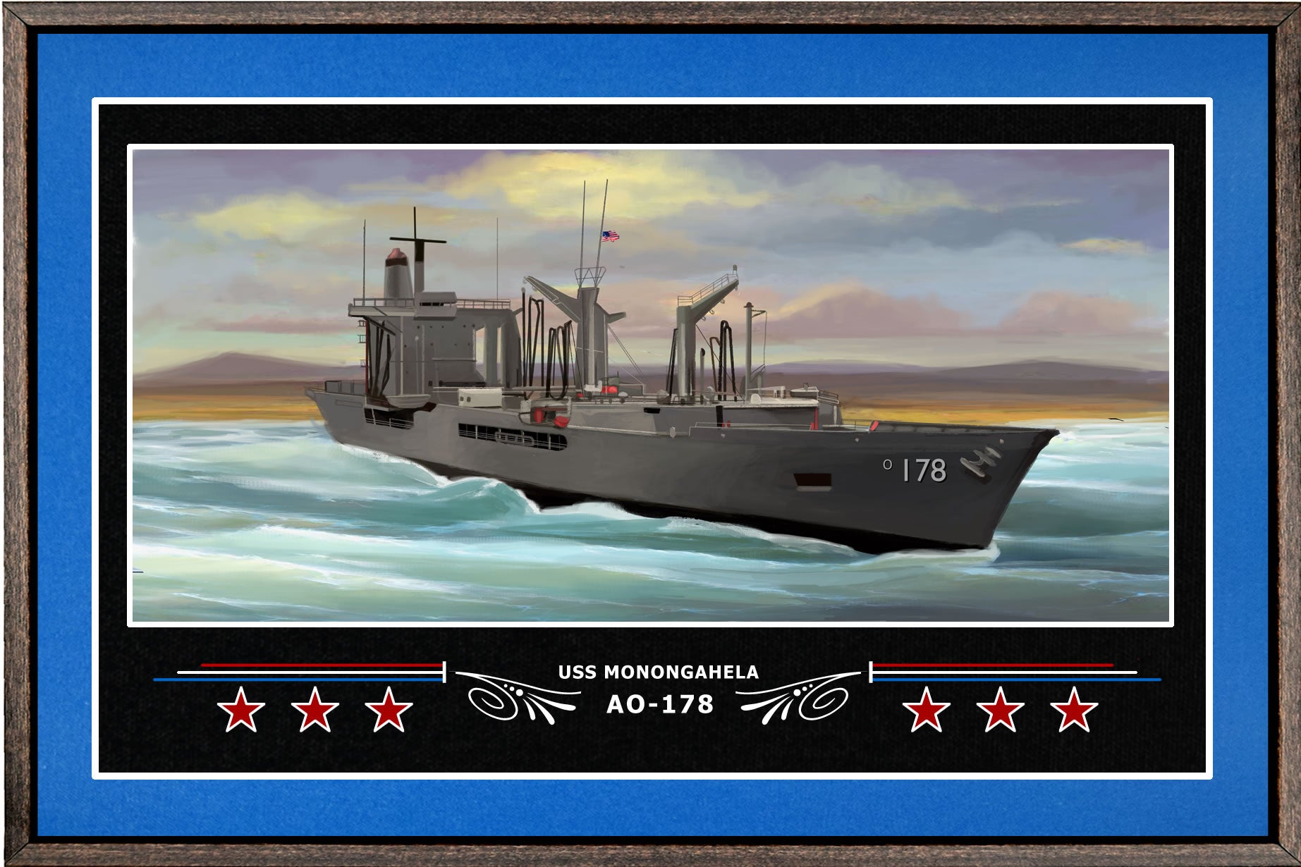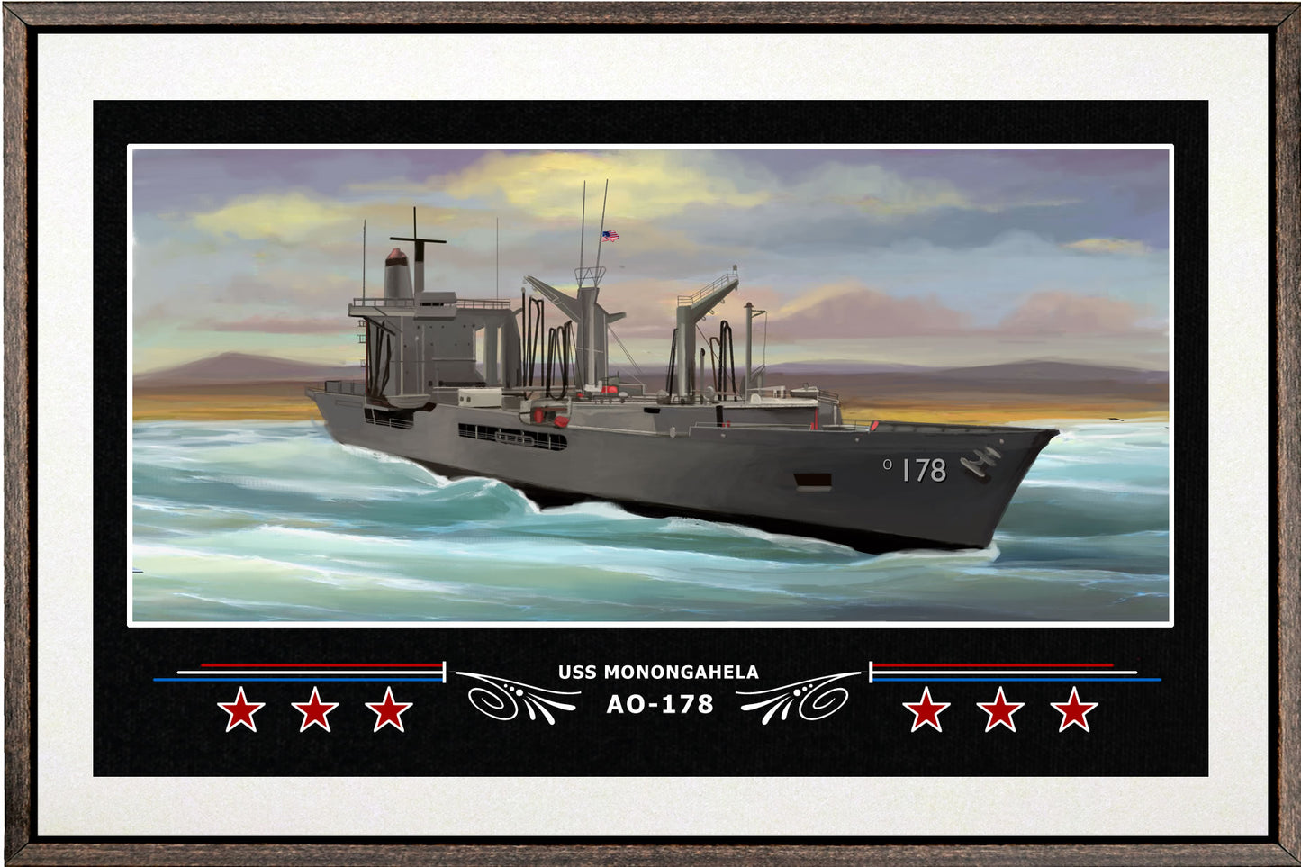 Your Navy Veteran will love this 18 x 12 inch canvas print of the USS Monongahela AO-178. This print is richly displayed in a walnut floating frame. Available in various border colors.
