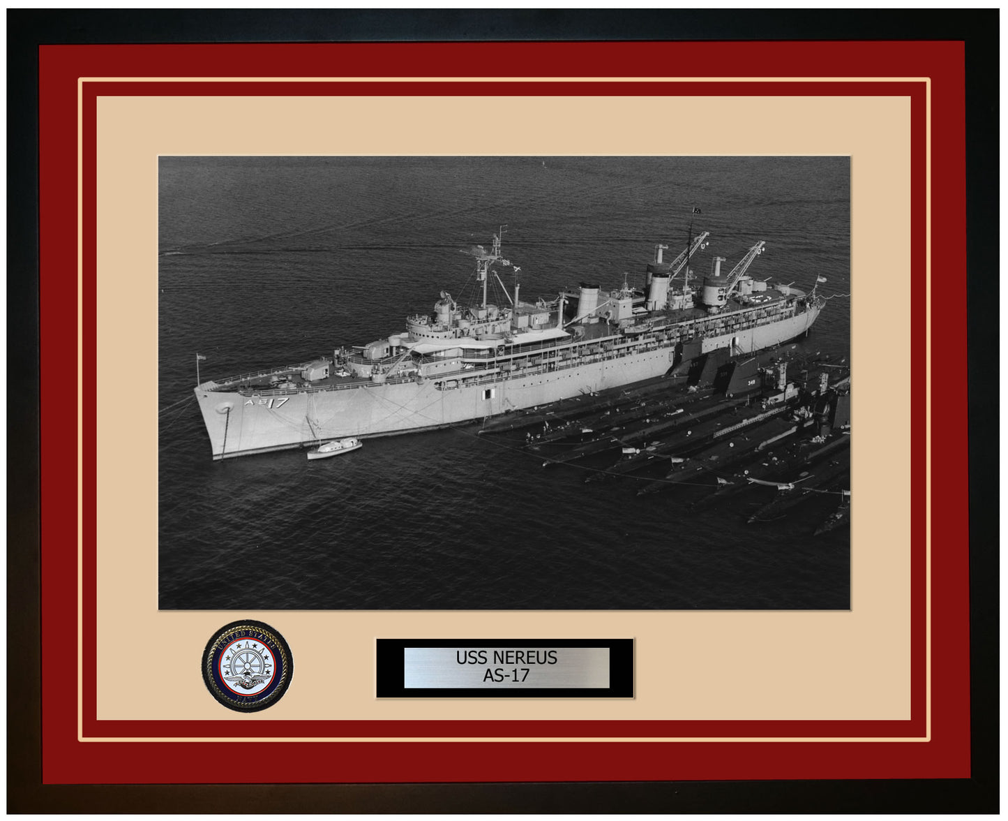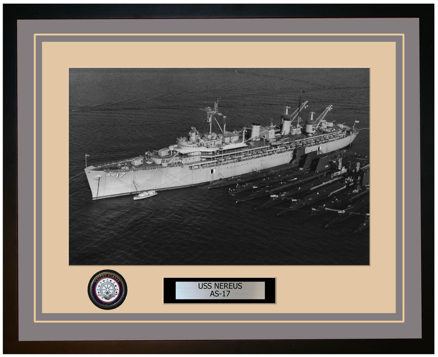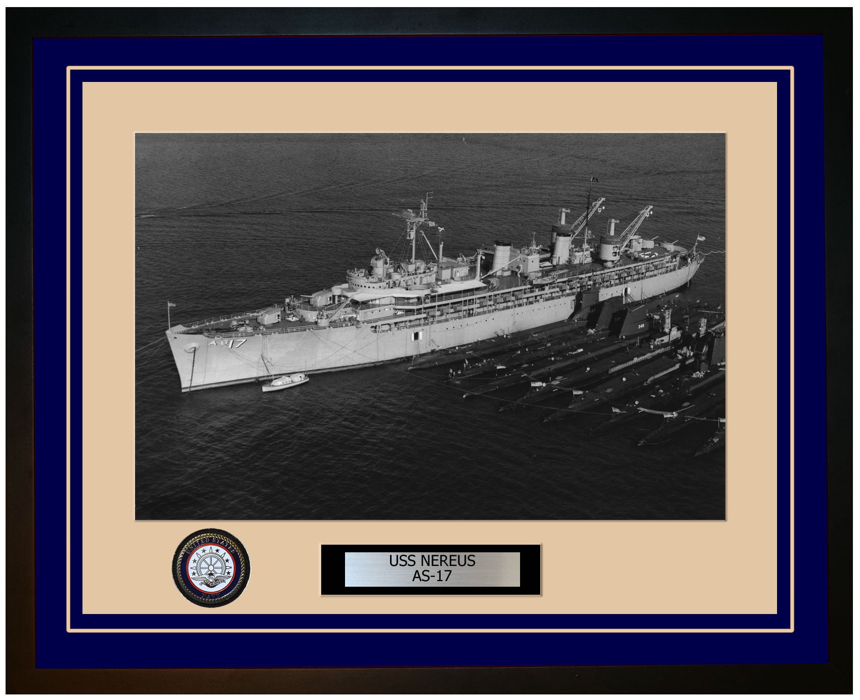 This photo of the USS NEREUS (AS-17) is framed and double matted with the highest quality construction in mind. The ship name and designation is engraved on chrome engraving stock and set on a beautiful felt backing. All this set in a custom cut fine inner mat and your choice of colors for the outer mat. The v-groove in the outer mat and custom engraving add high quality details that properly honor all the service members who served on this fine ship.
