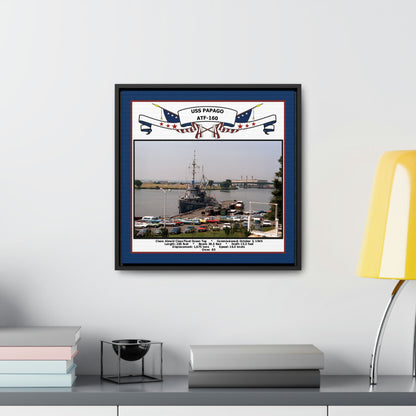 Your Navy Veteran will love this 16 x 16 inch canvas photo print of the USS Papago ATF-160. This print is richly displayed in a black floating frame. Available with a printed blue border color.
