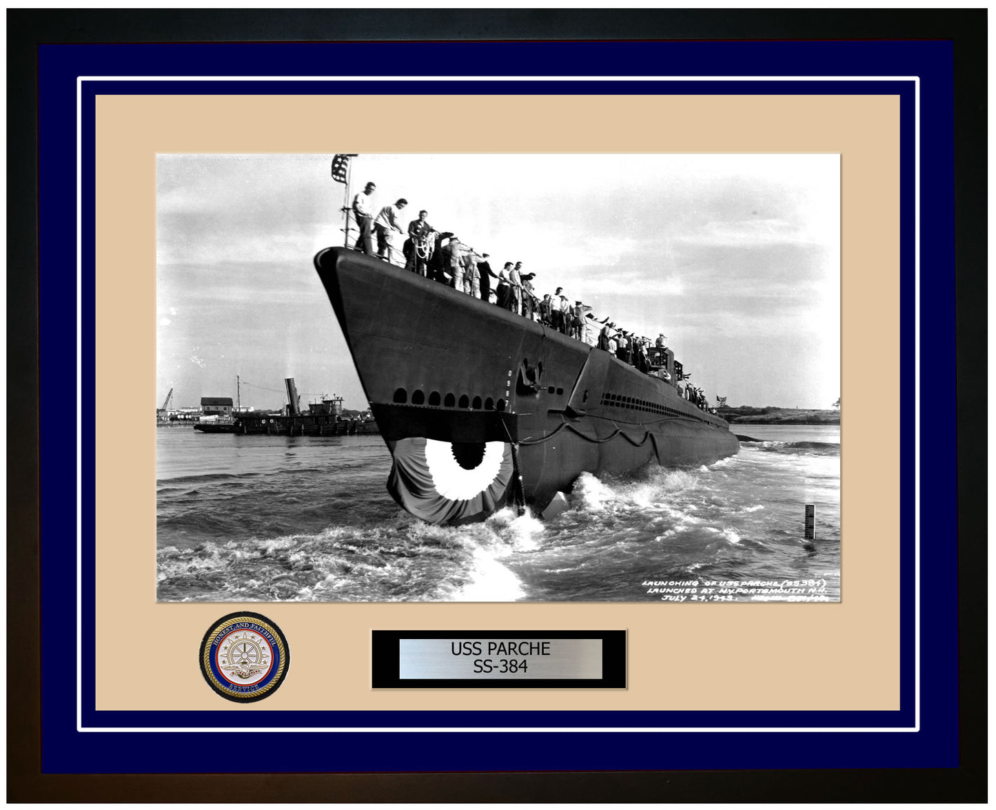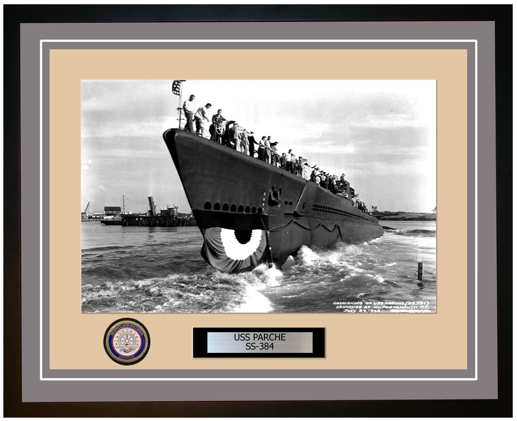 This photo of the USS Parche SS 384 is framed and double matted with the highest quality construction in mind. The ship name and designation is engraved on chrome engraving stock and set on a beautiful felt backing. All this set in a custom cut fine inner mat and your choice of colors for the outer mat. The v-groove in the outer mat and custom engraving add high quality details that properly honor all the service members who served on this fine ship.