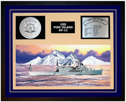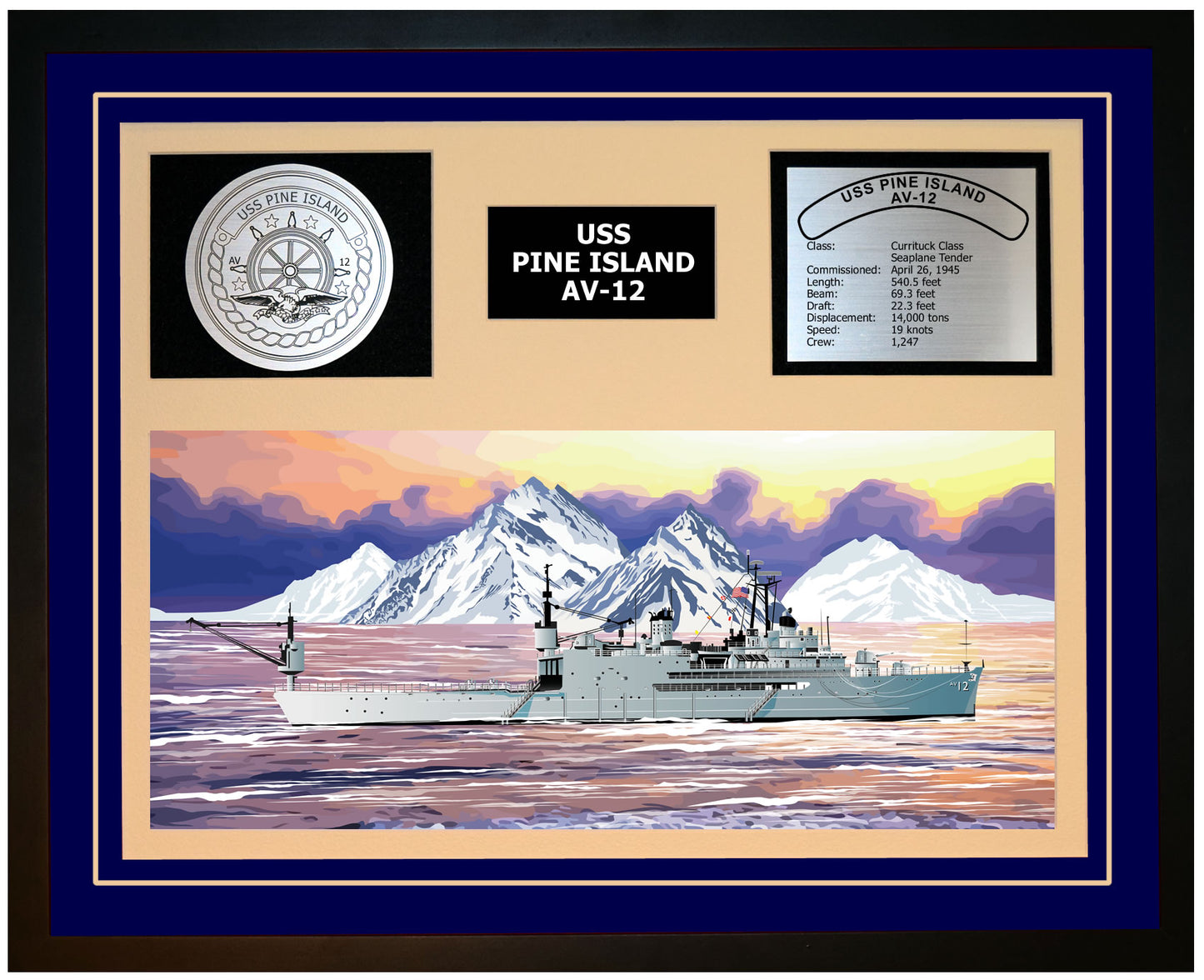 This is a beautiful ship display commemorating the USS PINE ISLAND (AV-12). The artwork depicts the USS PINE ISLAND in all her glory. More than just an artistic concept of the ship, this display includes a custom designed ship crest plaque and an engraved ship statistics plaque. This product is richly finished with custom cut and sized double mats and framed with a high quality black frame. Only the best materials are used to complete our ship displays. Navy Emporium Ship Displays make a generous and personal gift for any Navy sailor.