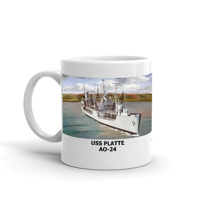 Celebrate your Navy pride with this USS PLATTE AO-24 Coffee Mug. Pictured is custom art of your ship! Whether you're drinking your morning coffee, evening tea, or something in between “ this mug's for you! It's sturdy and glossy with a vivid print that'll withstand the microwave and dishwasher.