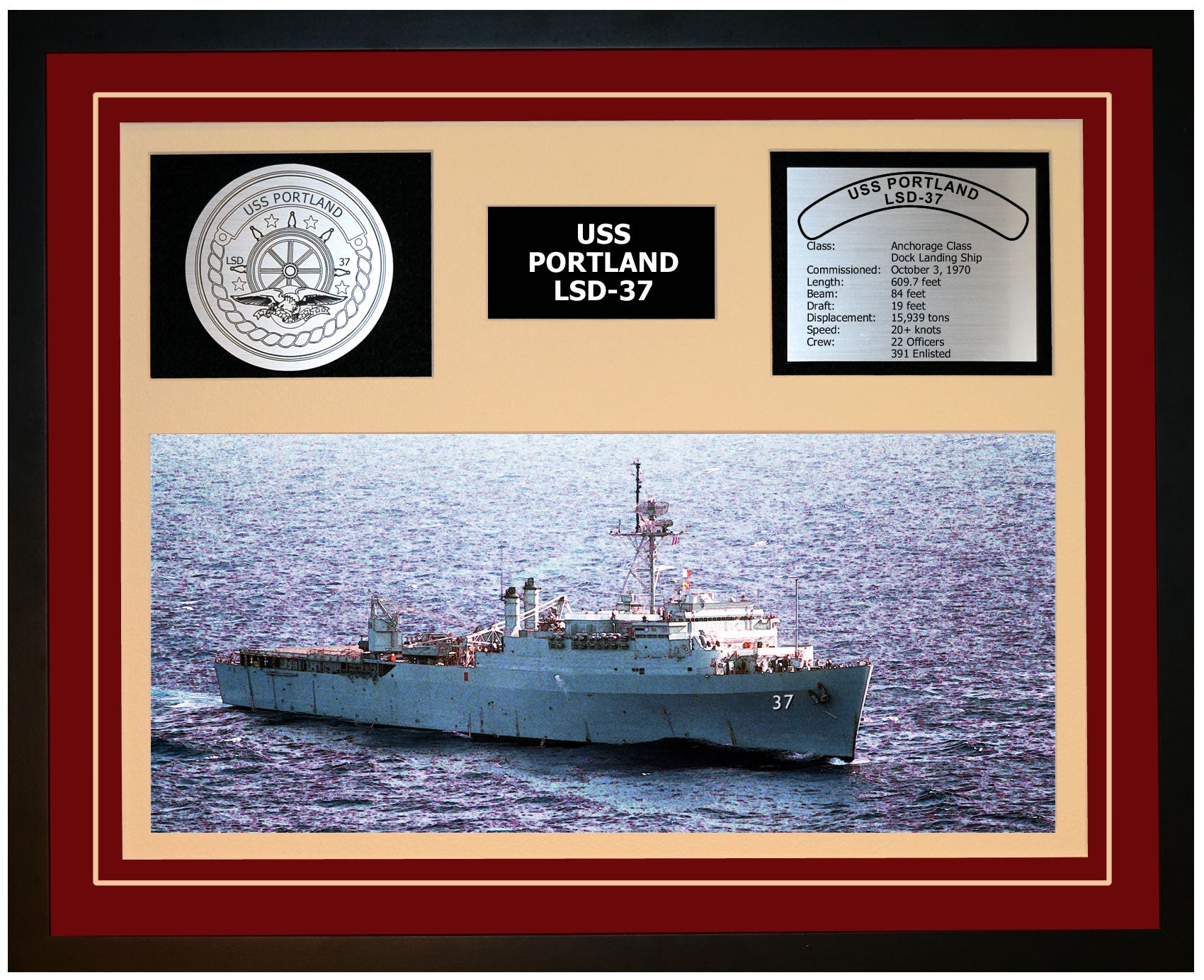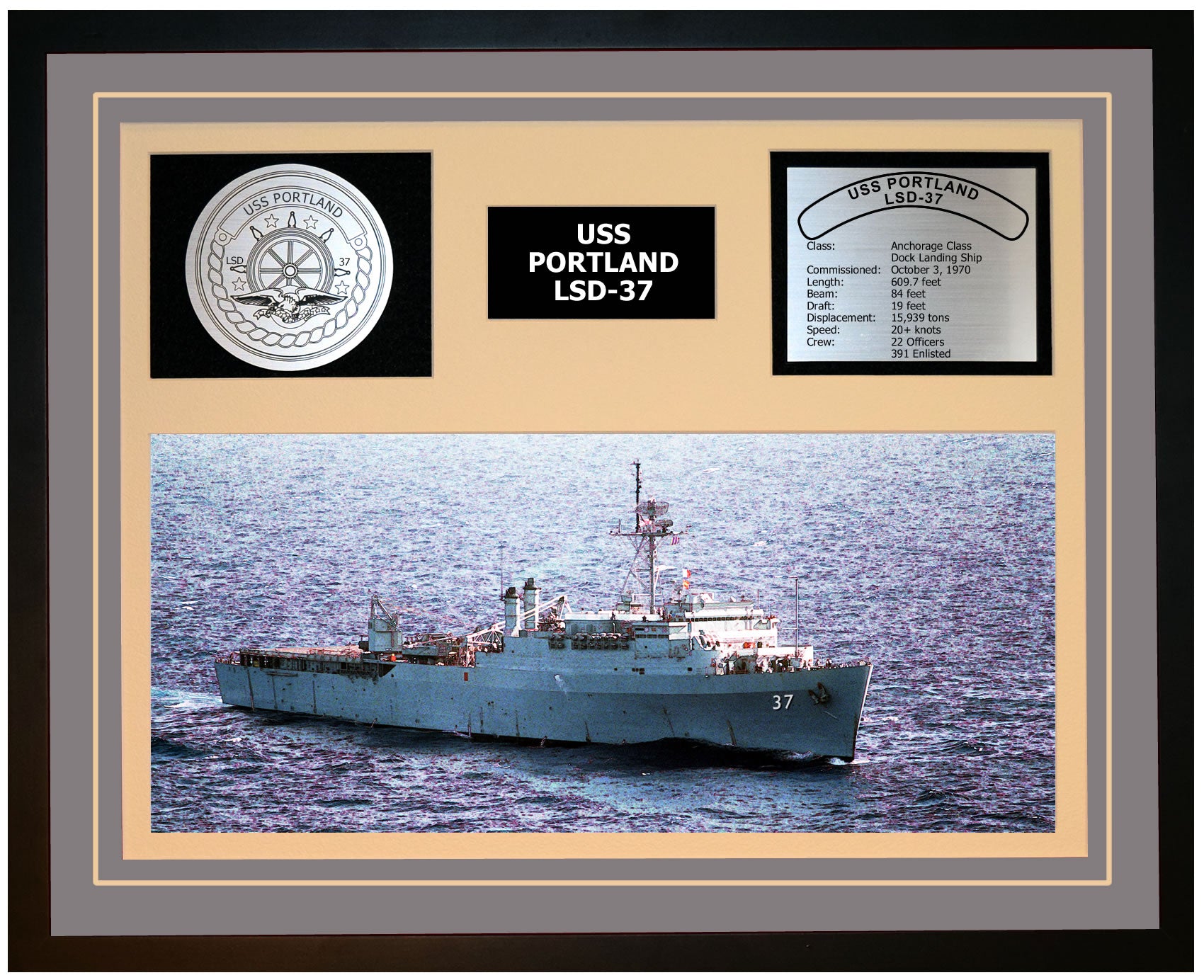 This is a beautiful ship display commemorating the USS PORTLAND (LSD-37). The artwork depicts the USS PORTLAND in all her glory. More than just an artistic concept of the ship, this display includes a custom designed ship crest plaque and an engraved ship statistics plaque. This product is richly finished with custom cut and sized double mats and framed with a high quality black frame. Only the best materials are used to complete our ship displays. Navy Emporium Ship Displays make a generous and personal gift for any Navy sailor.