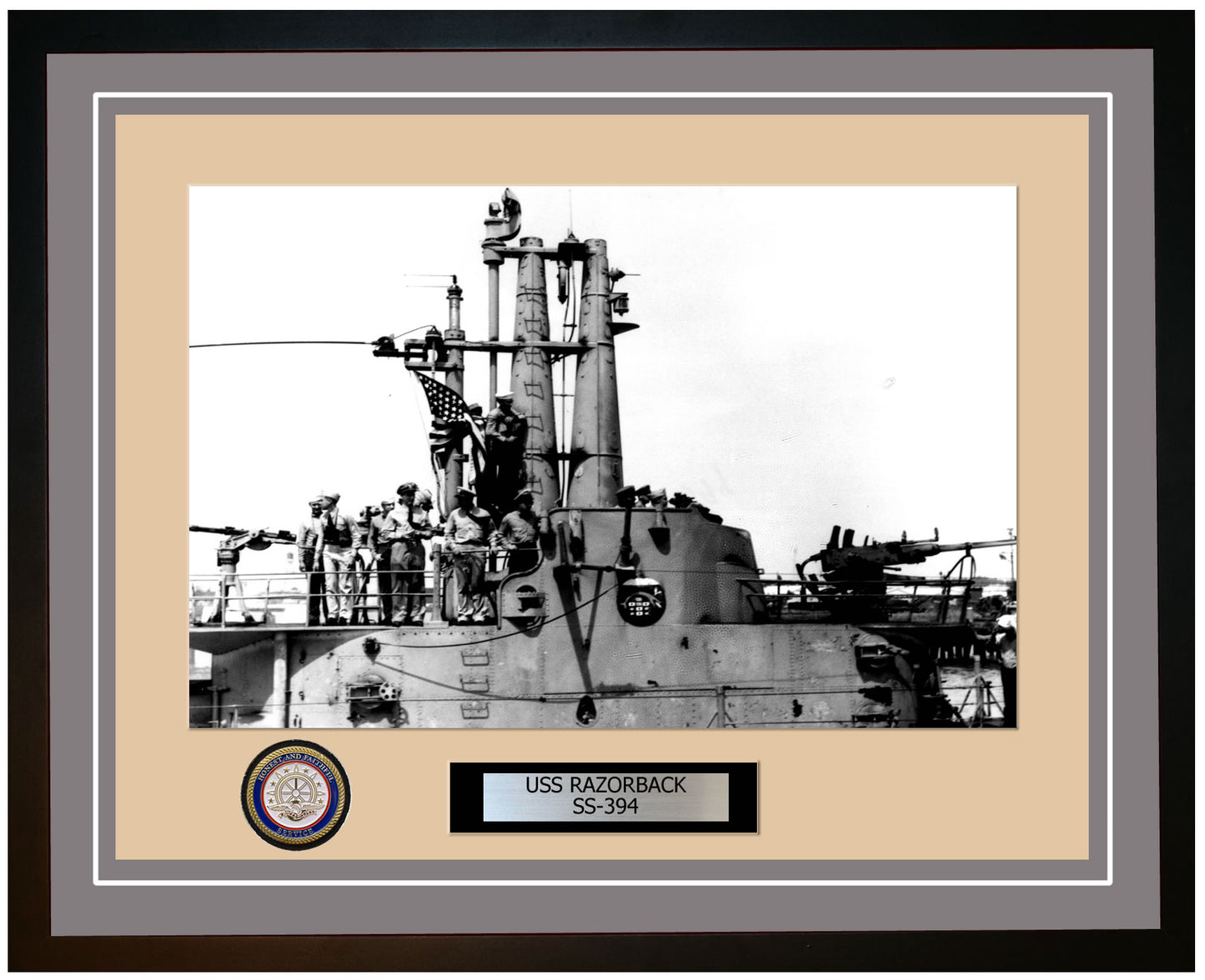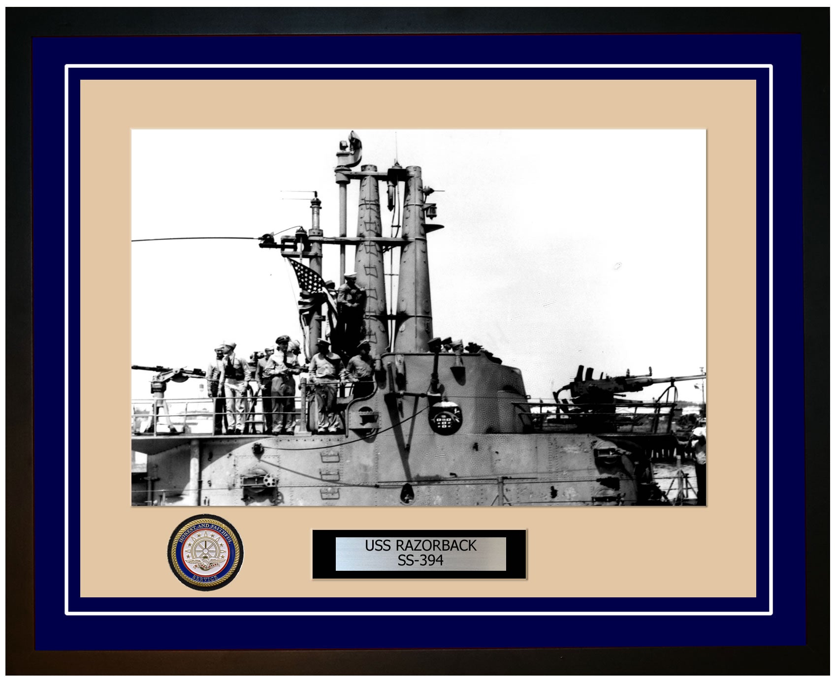 This photo of the USS Razorback SS 394 is framed and double matted with the highest quality construction in mind. The ship name and designation is engraved on chrome engraving stock and set on a beautiful felt backing. All this set in a custom cut fine inner mat and your choice of colors for the outer mat. The v-groove in the outer mat and custom engraving add high quality details that properly honor all the service members who served on this fine ship.