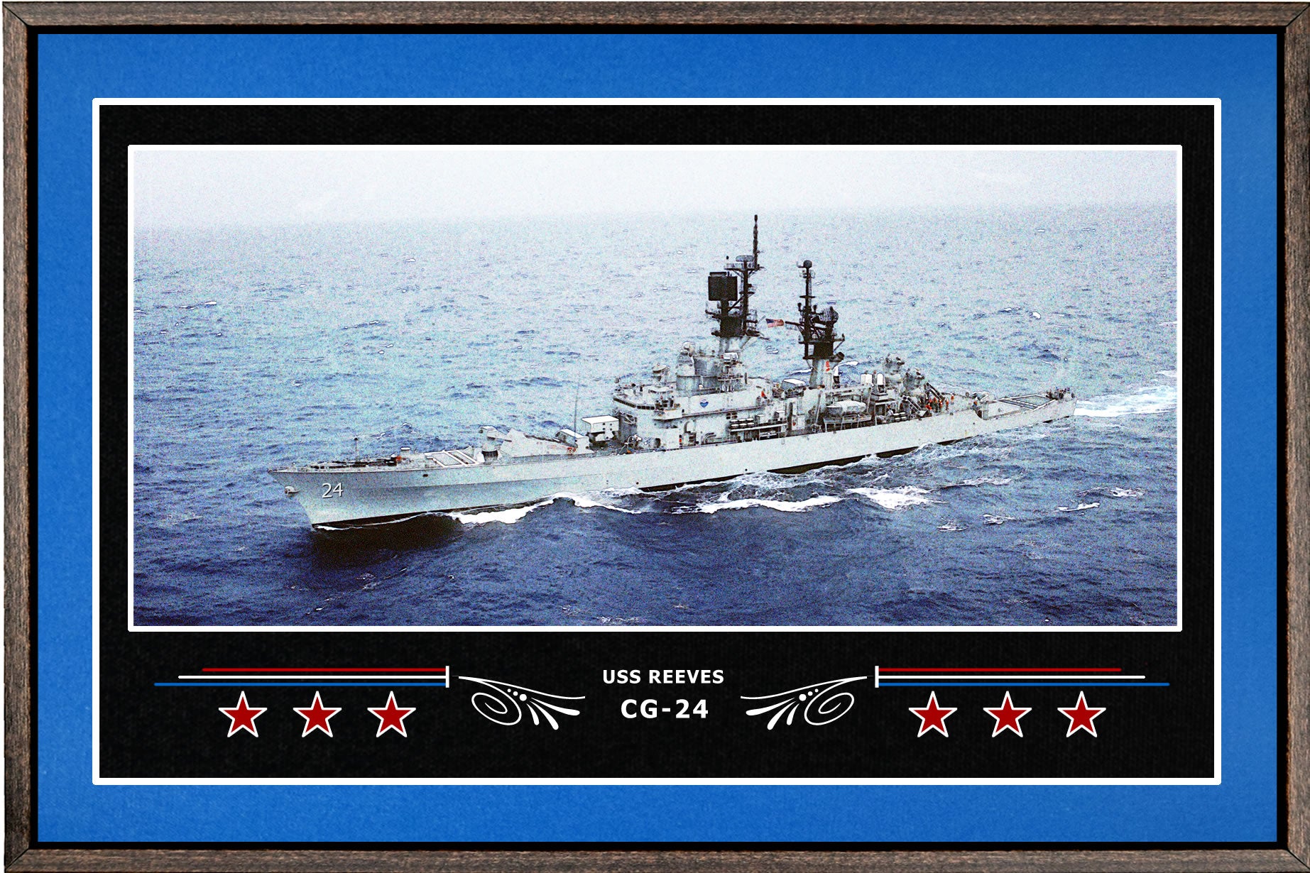 Your Navy Veteran will love this 18 x 12 inch canvas print of the USS Reeves CG-24. This print is richly displayed in a walnut floating frame. Available in various border colors.