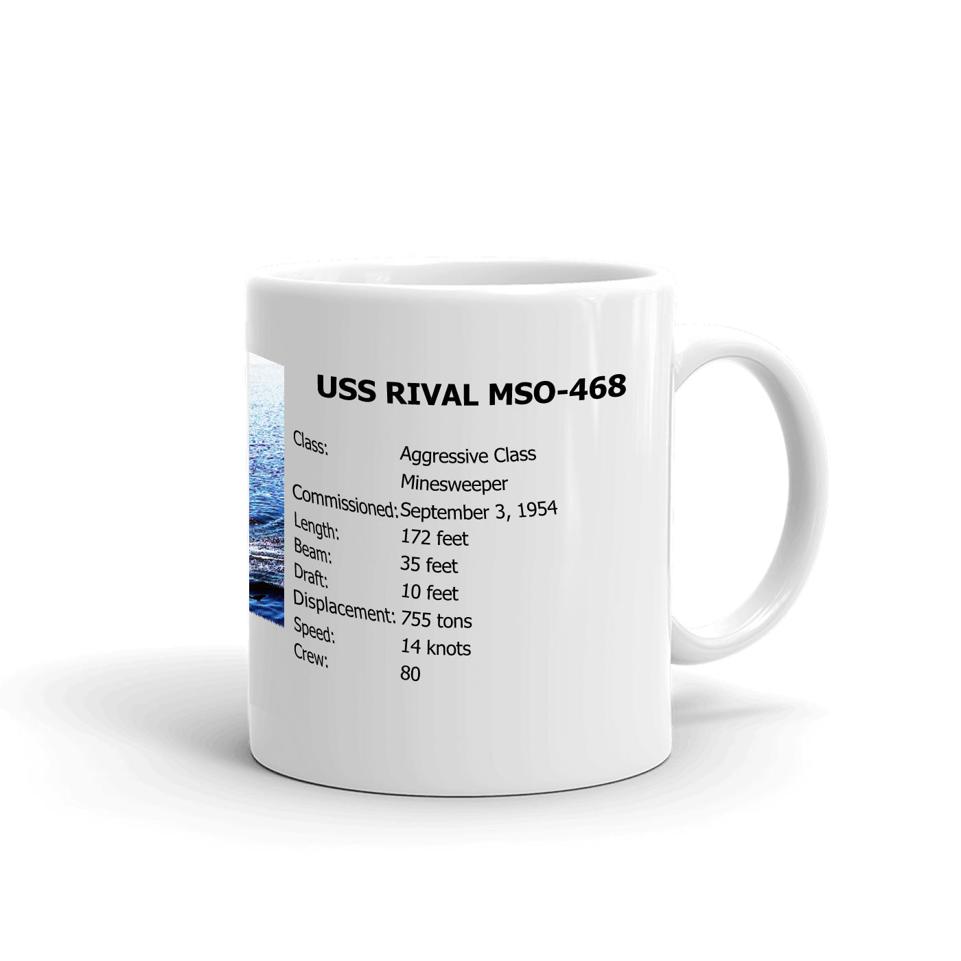 Celebrate your Navy pride with this USS RIVAL MSO-468 Coffee Mug. Pictured is custom art of your ship! Whether you're drinking your morning coffee, evening tea, or something in between “ this mug's for you! It's sturdy and glossy with a vivid print that'll withstand the microwave and dishwasher.