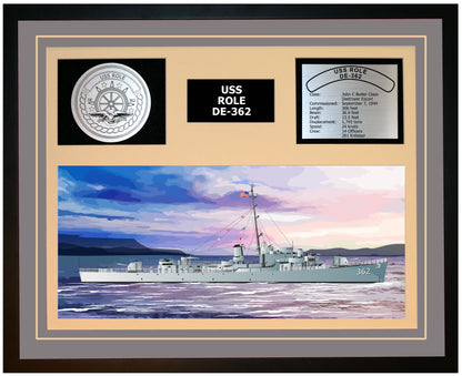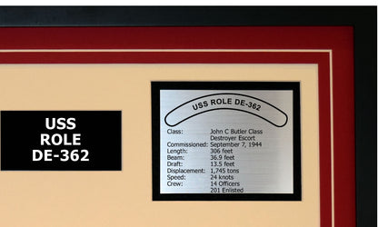 This is a beautiful ship display commemorating the USS ROLE (DE-362). The artwork depicts the USS ROLE in all her glory. More than just an artistic concept of the ship, this display includes a custom designed ship crest plaque and an engraved ship statistics plaque. This product is richly finished with custom cut and sized double mats and framed with a high quality black frame. Only the best materials are used to complete our ship displays. Navy Emporium Ship Displays make a generous and personal gift for any Navy sailor.