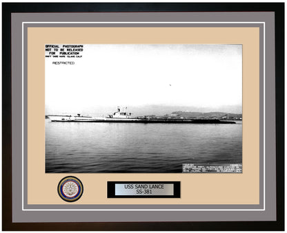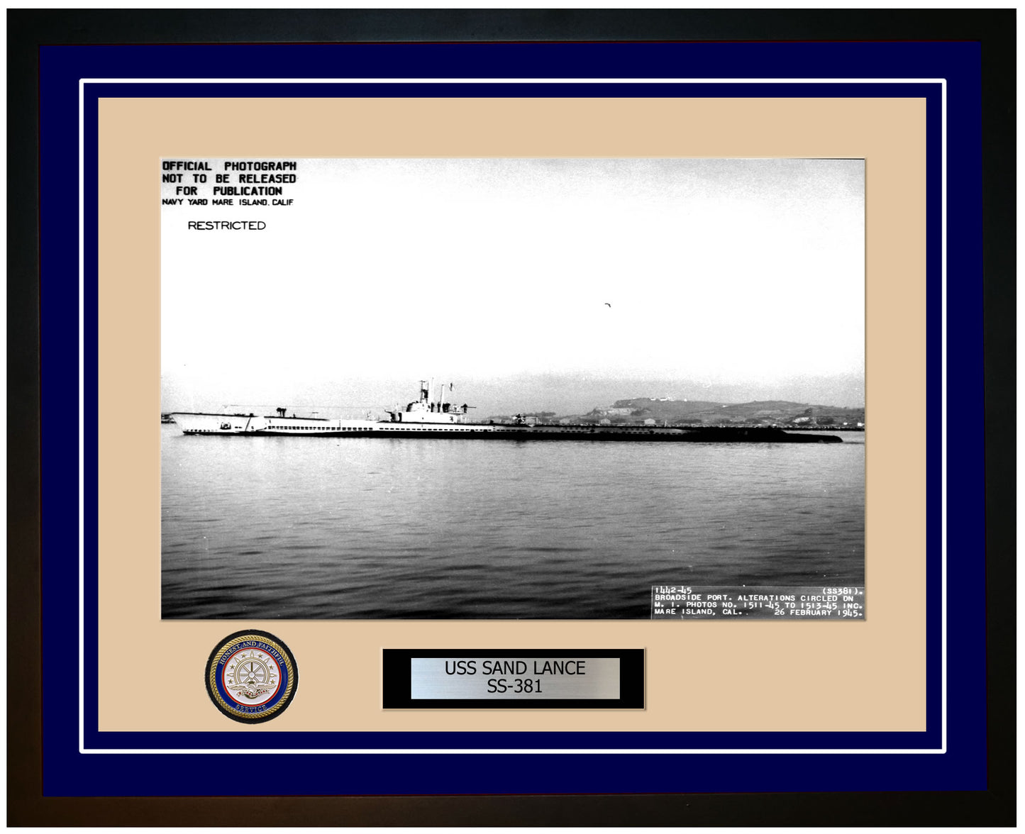 This photo of the USS Sand Lance SS 381 is framed and double matted with the highest quality construction in mind. The ship name and designation is engraved on chrome engraving stock and set on a beautiful felt backing. All this set in a custom cut fine inner mat and your choice of colors for the outer mat. The v-groove in the outer mat and custom engraving add high quality details that properly honor all the service members who served on this fine ship.