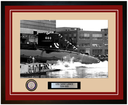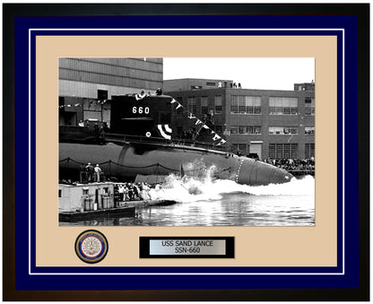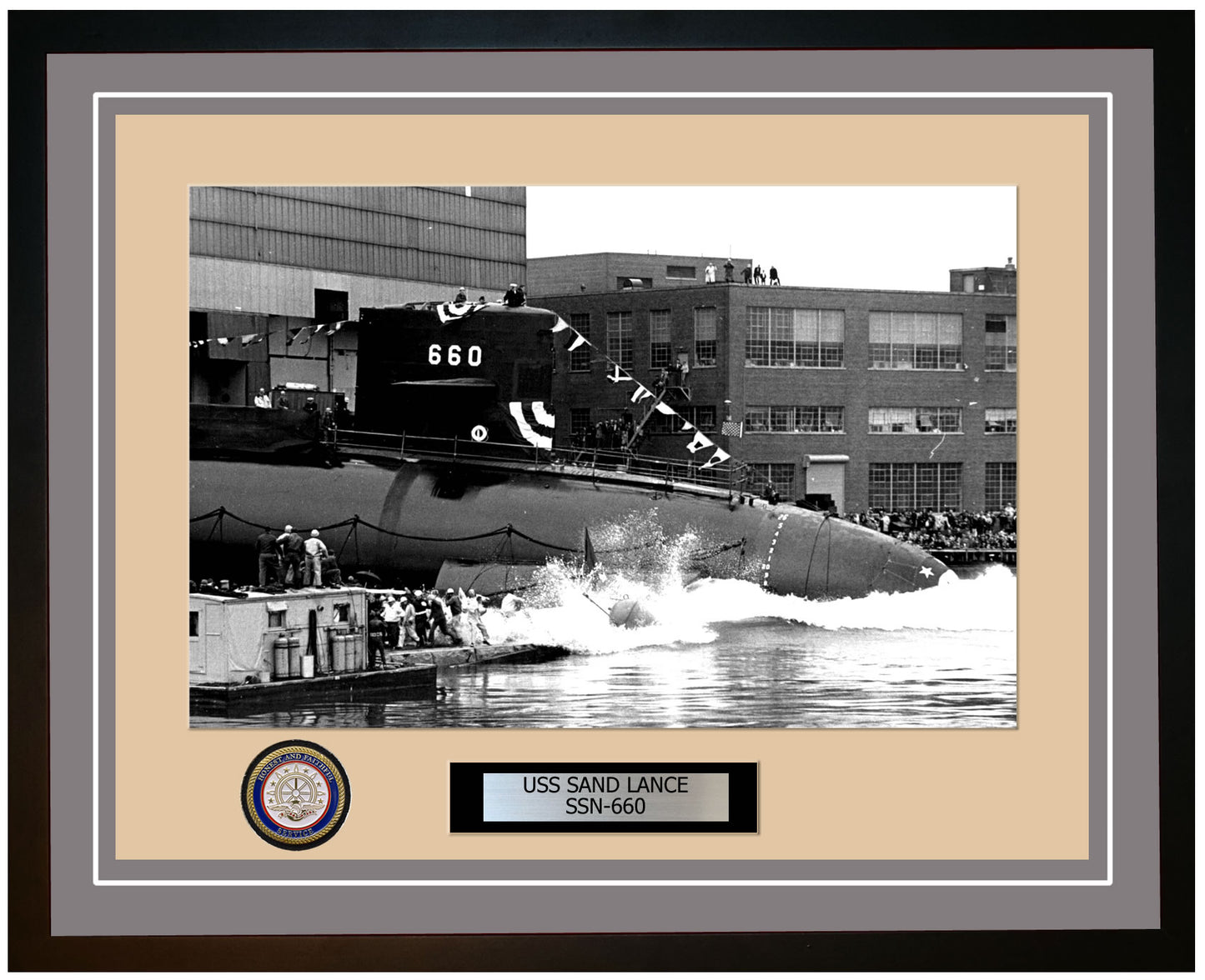 This photo of the USS Sand Lance SSN 660 is framed and double matted with the highest quality construction in mind. The ship name and designation is engraved on chrome engraving stock and set on a beautiful felt backing. All this set in a custom cut fine inner mat and your choice of colors for the outer mat. The v-groove in the outer mat and custom engraving add high quality details that properly honor all the service members who served on this fine ship.