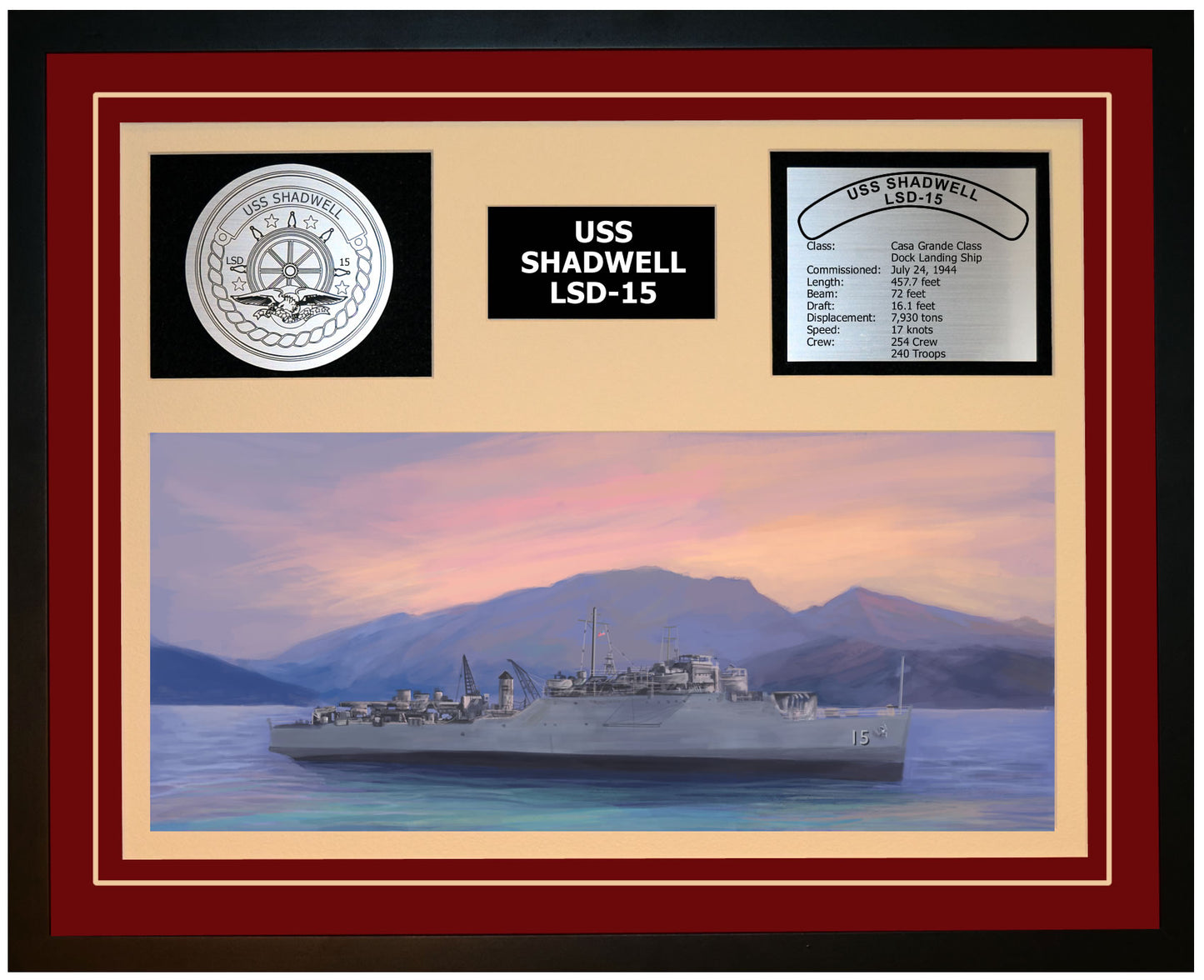This is a beautiful ship display commemorating the USS SHADWELL (LSD-15). The artwork depicts the USS SHADWELL in all her glory. More than just an artistic concept of the ship, this display includes a custom designed ship crest plaque and an engraved ship statistics plaque. This product is richly finished with custom cut and sized double mats and framed with a high quality black frame. Only the best materials are used to complete our ship displays. Navy Emporium Ship Displays make a generous and personal gift for any Navy sailor.