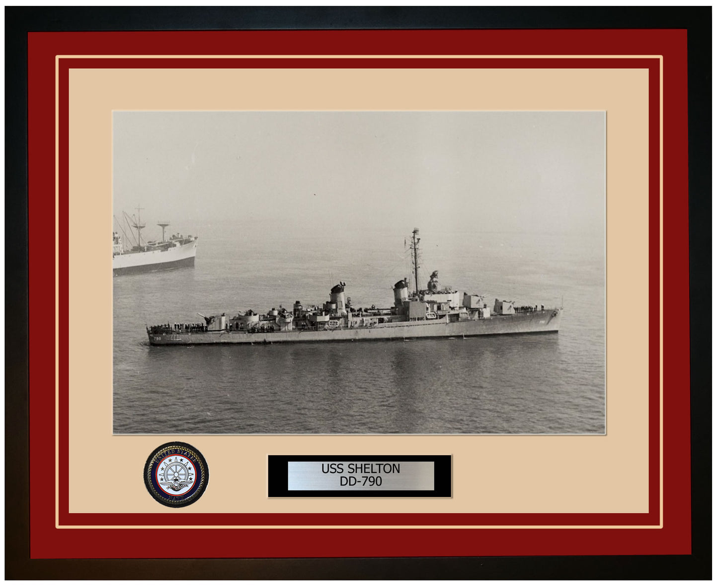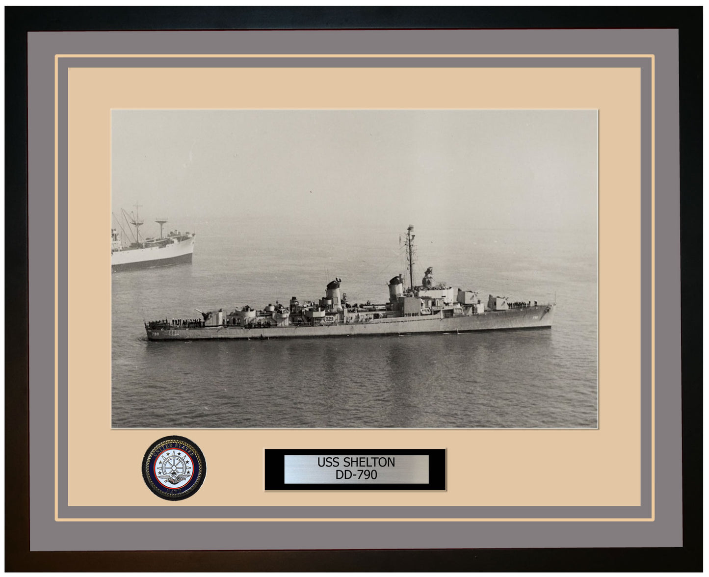 This photo of the USS SHELTON (DD-790) is framed and double matted with the highest quality construction in mind. The ship name and designation is engraved on chrome engraving stock and set on a beautiful felt backing. All this set in a custom cut fine inner mat and your choice of colors for the outer mat. The v-groove in the outer mat and custom engraving add high quality details that properly honor all the service members who served on this fine ship.