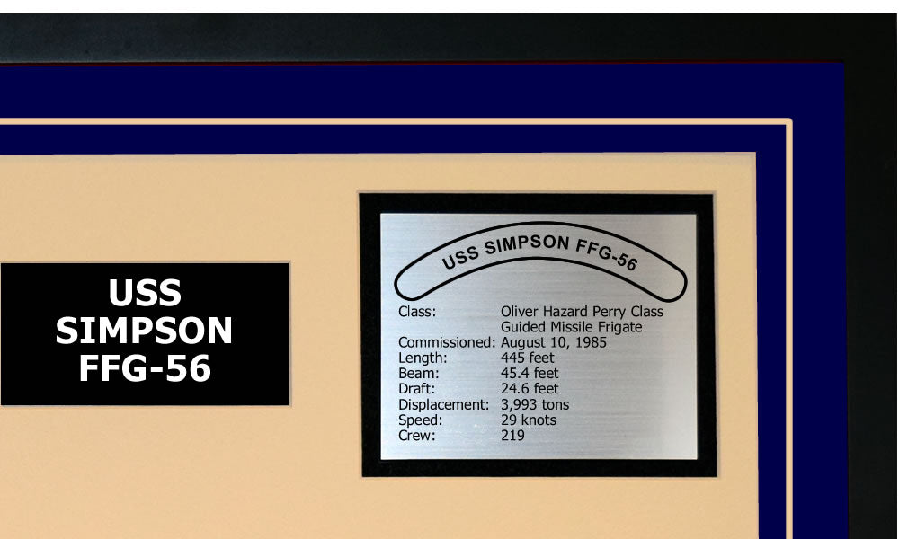 This is a beautiful ship display commemorating the USS SIMPSON (FFG-56). The artwork depicts the USS SIMPSON in all her glory. More than just an artistic concept of the ship, this display includes a custom designed ship crest plaque and an engraved ship statistics plaque. This product is richly finished with custom cut and sized double mats and framed with a high quality black frame. Only the best materials are used to complete our ship displays. Navy Emporium Ship Displays make a generous and personal gift for any Navy sailor.