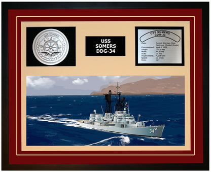 This is a beautiful ship display commemorating the USS SOMERS (DDG-34). The artwork depicts the USS SOMERS in all her glory. More than just an artistic concept of the ship, this display includes a custom designed ship crest plaque and an engraved ship statistics plaque. This product is richly finished with custom cut and sized double mats and framed with a high quality black frame. Only the best materials are used to complete our ship displays. Navy Emporium Ship Displays make a generous and personal gift for any Navy sailor.