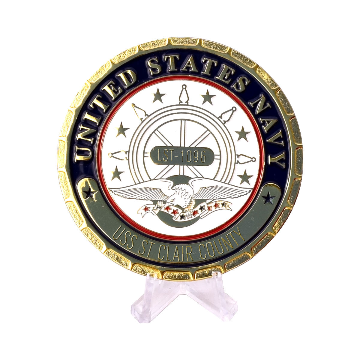 Display your Navy pride for all to see with the personalized USS St Clair County (LST-1096) Navy Ship Plaque. We are offering this premium metal plaque measuring 3" in diameter and includes an acrylic stand, high quality quilted gift box, and up to three lines of engraved personalization! Show your pride in the USS St Clair County and your proud contribution to the freedom of our nation!