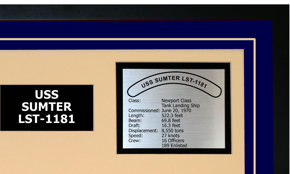 This is a beautiful ship display commemorating the USS SUMTER (LST-1181). The artwork depicts the USS SUMTER in all her glory. More than just an artistic concept of the ship, this display includes a custom designed ship crest plaque and an engraved ship statistics plaque. This product is richly finished with custom cut and sized double mats and framed with a high quality black frame. Only the best materials are used to complete our ship displays. Navy Emporium Ship Displays make a generous and personal gift for any Navy sailor.