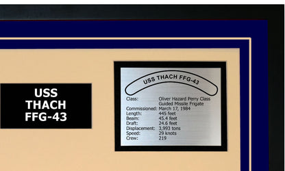 This is a beautiful ship display commemorating the USS THACH (FFG-43). The artwork depicts the USS THACH in all her glory. More than just an artistic concept of the ship, this display includes a custom designed ship crest plaque and an engraved ship statistics plaque. This product is richly finished with custom cut and sized double mats and framed with a high quality black frame. Only the best materials are used to complete our ship displays. Navy Emporium Ship Displays make a generous and personal gift for any Navy sailor.