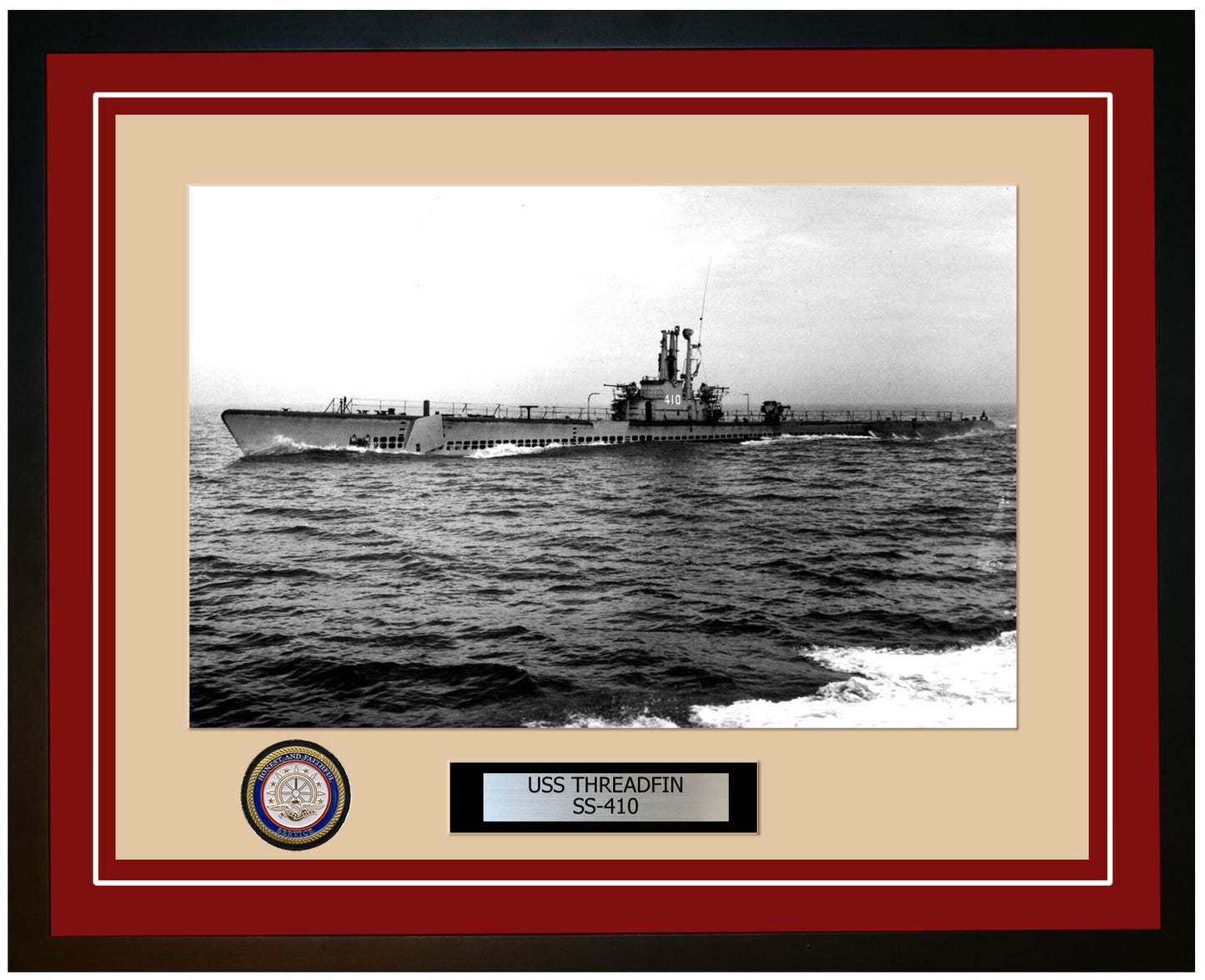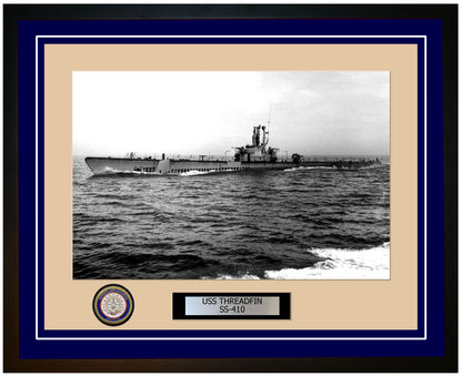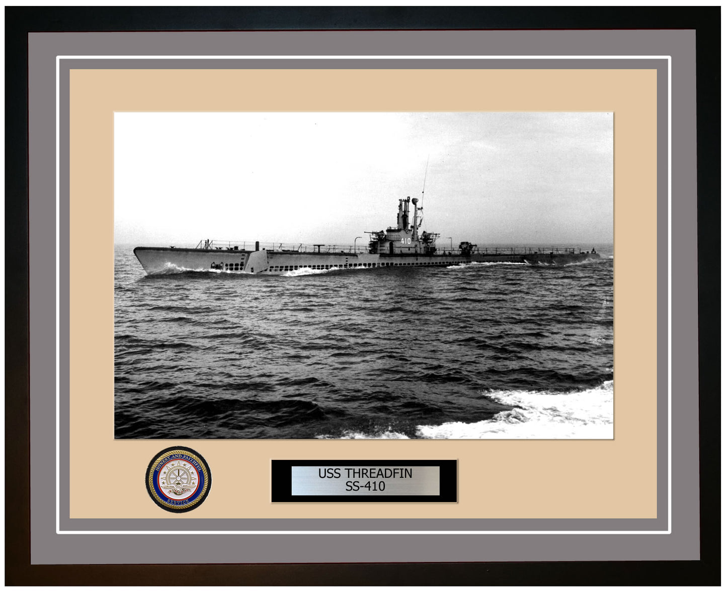 This photo of the USS Threadfin SS 410 is framed and double matted with the highest quality construction in mind. The ship name and designation is engraved on chrome engraving stock and set on a beautiful felt backing. All this set in a custom cut fine inner mat and your choice of colors for the outer mat. The v-groove in the outer mat and custom engraving add high quality details that properly honor all the service members who served on this fine ship.